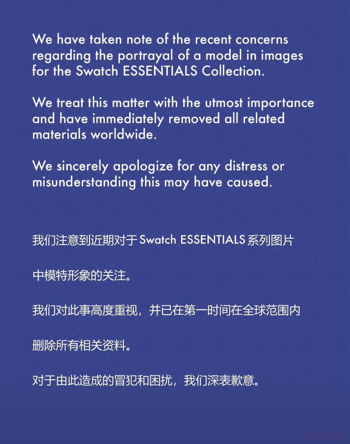 8月16日,瑞士斯沃琪品牌官方账号就“模特图涉嫌辱华”事件发布致歉声明。声明称,公司已注意到近期对Swatch ESSENTIALS系列图片中模特形象的关注,对此高度重视,并第一时间在全球范围内删除所有相关资料,对造成的冒犯和困扰深表歉意。
