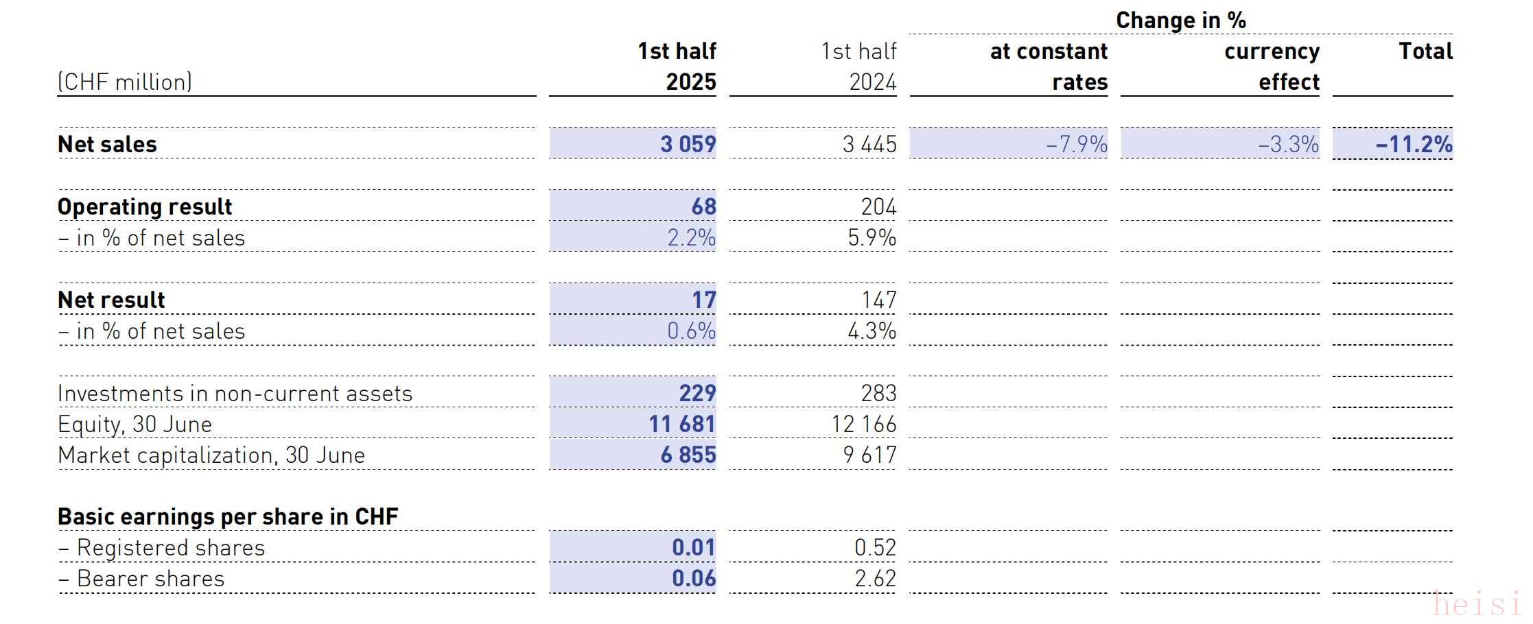 斯沃琪集团上半年正面临严峻的业绩下滑压力。最新公布的2025年上半年财报显示,公司实现销售额30.59亿瑞士法郎,同比下滑11.2%;净利润更是从去年同期的1.47亿瑞士法郎大幅下滑88%,至1700万瑞士法郎;净利润率仅为0.6%,远低于去年同期的4.3%。