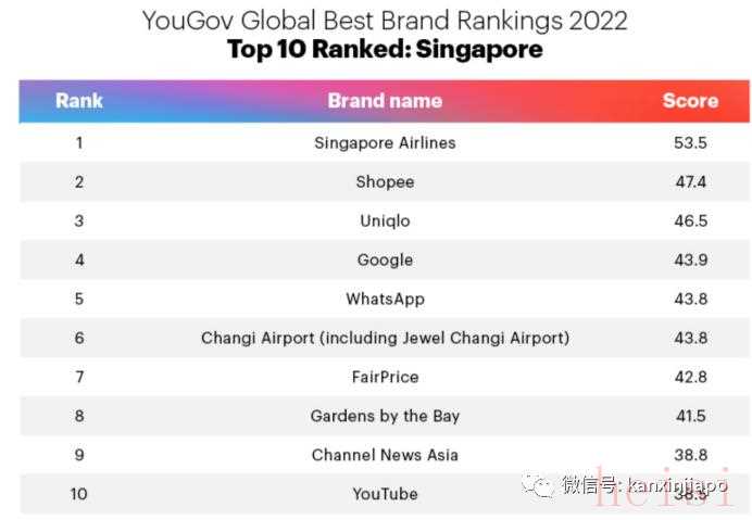 其余进入前十名的品牌还有WhatsApp、樟宜机场、Fairprice、滨海湾花园、亚洲新闻频道(CNA)和YouTube。