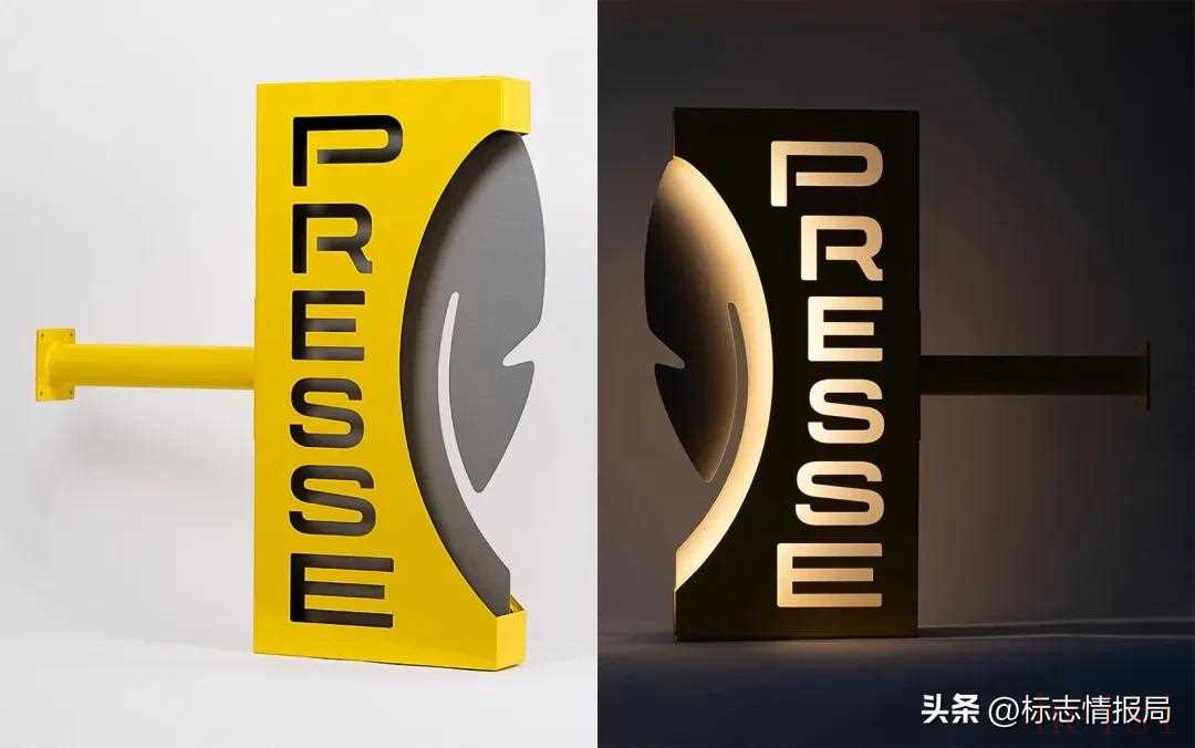 Presse原先的标志是一个橙色的圆角菱形招牌,上面有一只红色羽毛笔和黑色的PRESSE字样,看上去非常醒目,且有辨识度。此次更换的新标识保留了原有的矩形主体,并在一侧加入了一道灰色金属弧线。该造型的设计感来自旧标识中的经典的羽毛笔元素。不过,这一次并没有直接还原那支笔的形状,而是通过更简洁、抽象的方式加以演绎,旨在从传统符号中提炼出现代感,传达一种延续而非割裂的设计理念。