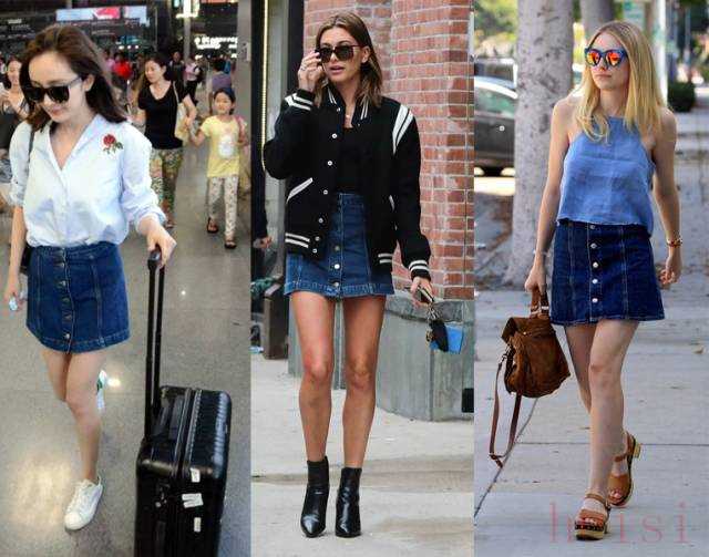 当然,除了牛仔裤其中那条纽扣A字裙也是立刻风靡明星圈,成为人手一条的出街利器。