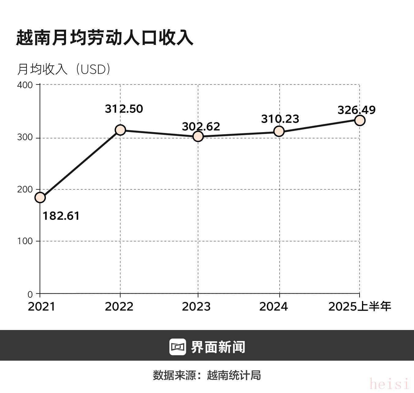 根据越南国家统计总局历年发布的社会经济报告,过去五年间,越南劳动者的平均月收入几乎实现翻倍,从2020年的约182美元上升至2025年上半年的约339美元,逐渐告别“廉价劳动力”。