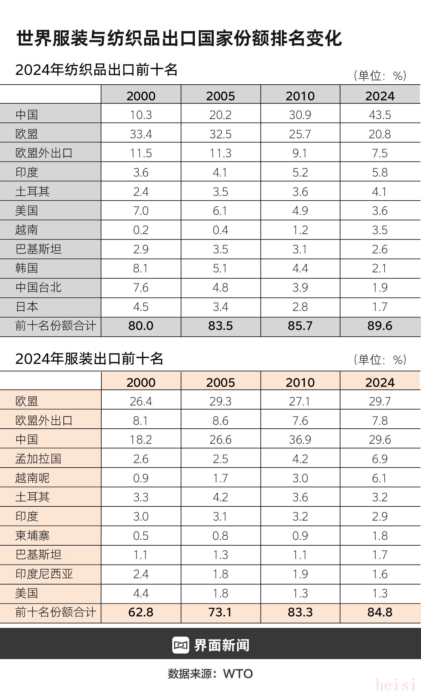 世界贸易组织(WTO)数据显示,2024年中国服装及衣着附件出口额达1591.4亿美元,占全球市场份额29.6%,略低于欧盟的29.7%,为2005年以来首次退居次席。