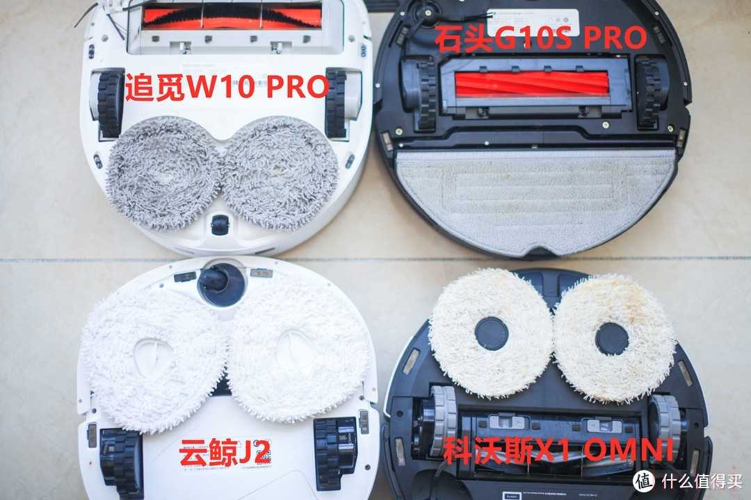 机身底部造型的区别就更大了,可以明显的看到各家的方案不同,最明显的是云鲸J2采用的是双拖布前置设计,而且是唯一一款拖地和扫地需要手动更换模块的机器(这在使用中是个减分项),其他三家则采用了拖布后置的方案。