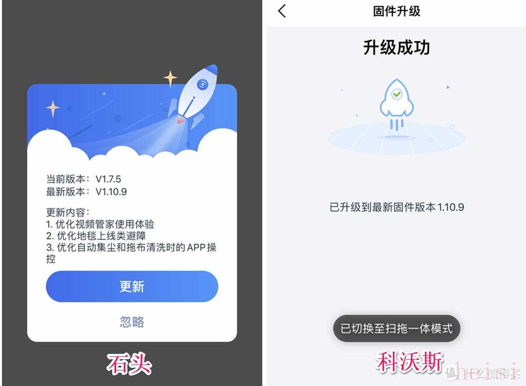 要佐证上面的结论很简单,这是在测试机器到手后,第一次连接APP时的升级记录,石头和科沃斯的工程师对于升级固件还是很勤奋的。至于追觅和云鲸嘛,这几台机子到我家里两周了,还没见过升级提示是啥样的。