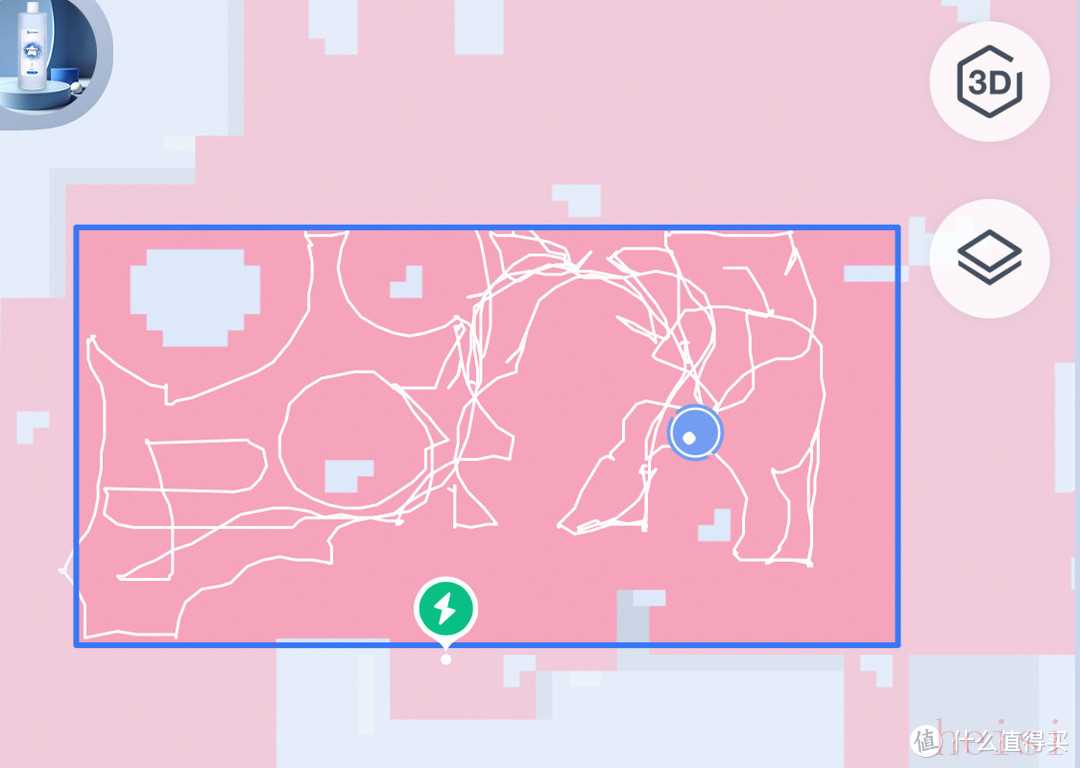 这是追觅最后生成的清洁路径,可以看到在框选区中的地面都得到了有效清洁,放置在障碍物中间的拖鞋也顺利识别,不过数据线和可乐并没有识别出来。