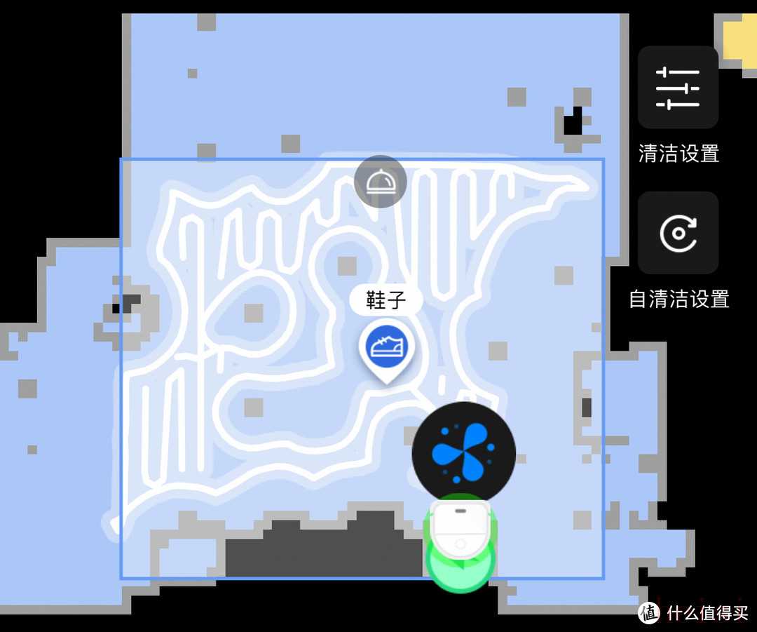 清扫完成后的导航图看起来很乐观,规划框内的清扫成绩是全部覆盖,嗯,东西都推开了,自然能全覆盖啦。