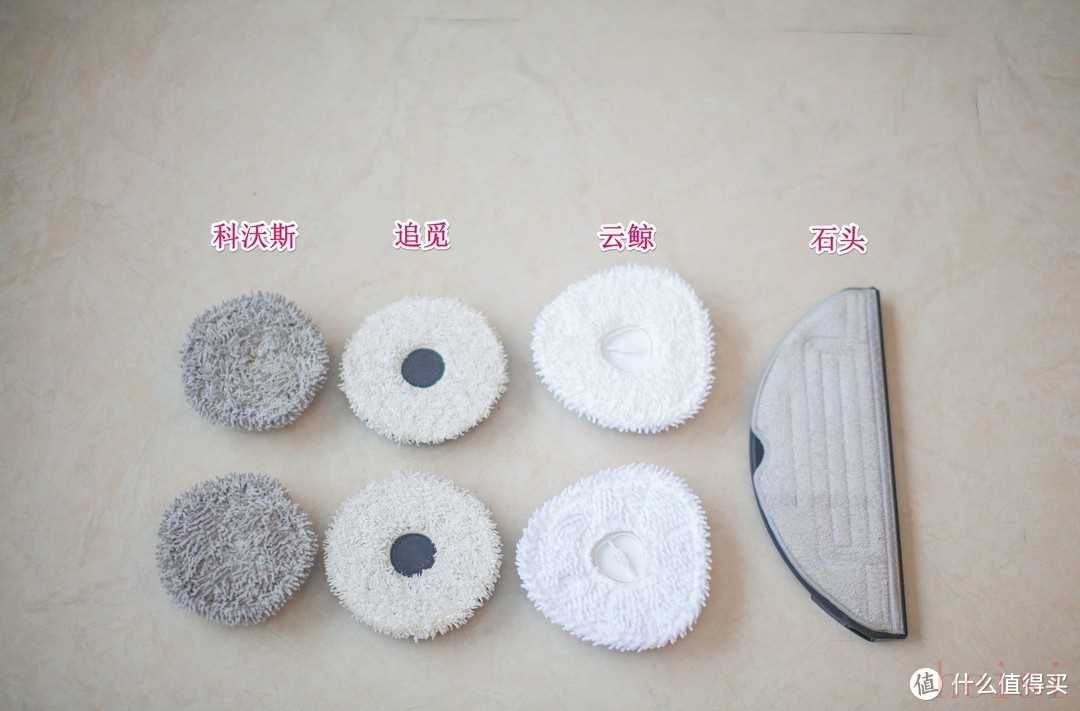 四台机器的拖布区别也很大,除了石头,另外三家都是采用了圆形或者类圆形的旋转拖布。而石头是唯一采用3000次/分钟震动频率的恒湿加压拖布(好长的名字),这是石头科技从T7S系列开始就发展出来的技术,据我之前的测试结果(我是T7S和云鲸J1的老用户),在目前的擦地机里是效果最好的,再配合它独门的拖布自动抬升技术,更是吊打一众友商(后面有详细的实测)。