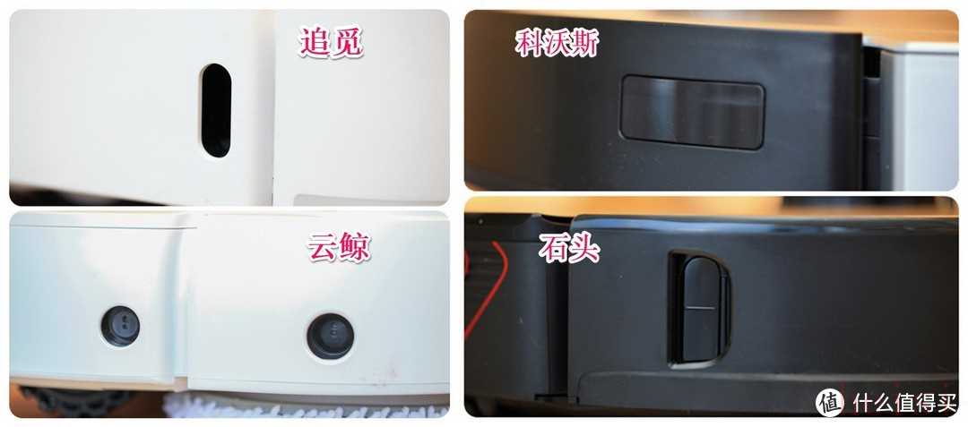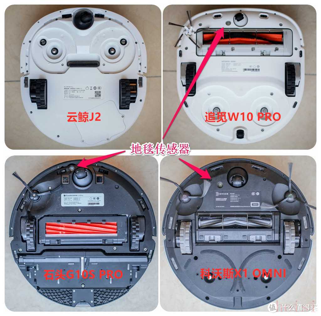 更换一下角度可以看的更加清楚,石头、科沃斯、追觅这三台机器在底部传感器配置上是几乎一致的,都是6悬崖+地毯传感器,而左上角的云鲸就要差很多,它的底部仅有4个悬崖传感器,无地毯传感器,考虑到这货价格甚至比追觅还贵一些,这就有点说不过去了。