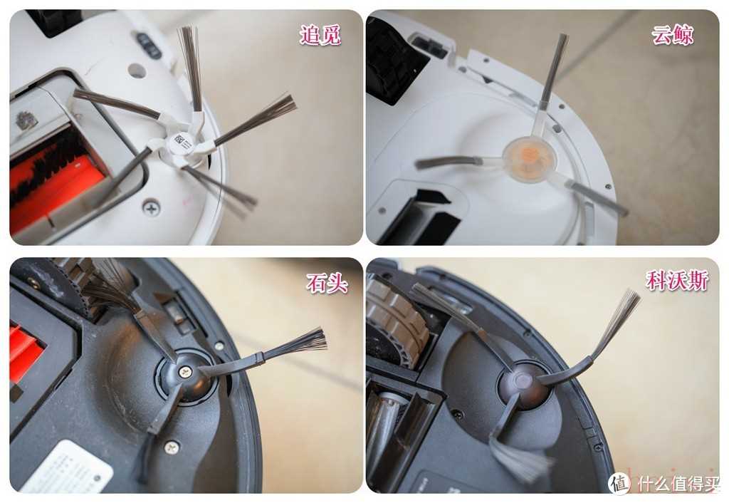 接下来我们再看看边刷,这四台机器里采用双边刷设计的是科沃斯和云鲸,另两家则保持单边刷结构,这两种设计谁好谁坏到目前并没有结论,对此我也不置可否。