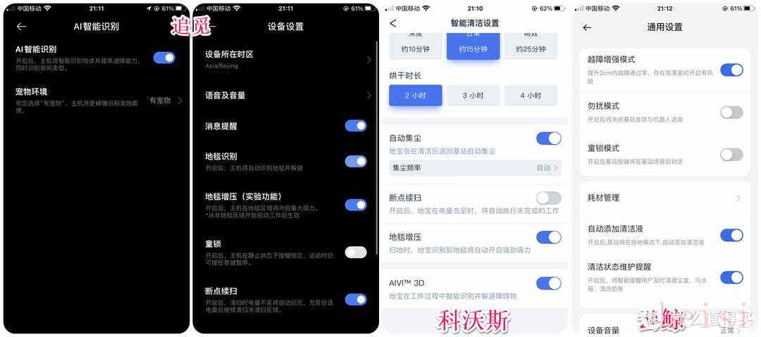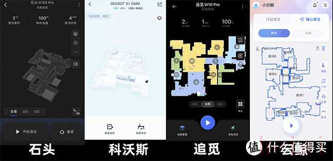 小结:这个环节上科沃斯的3D旋转地图更漂亮一些,而石头的APP功能最多(也支持3D旋转),追觅和云鲸的APP没啥特别的亮点。