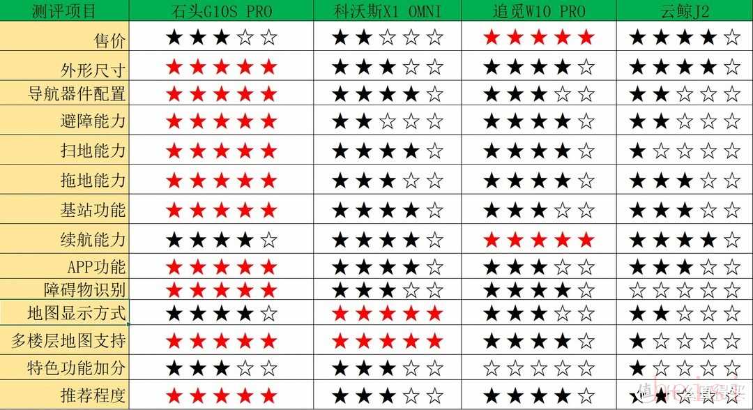 小结:性能参数对比环节,石头以比对手更多更丰富的传感器,全浮动纯胶主刷和可拆卸内置水箱拔得头筹,科沃斯和追觅次之,云鲸垫底。