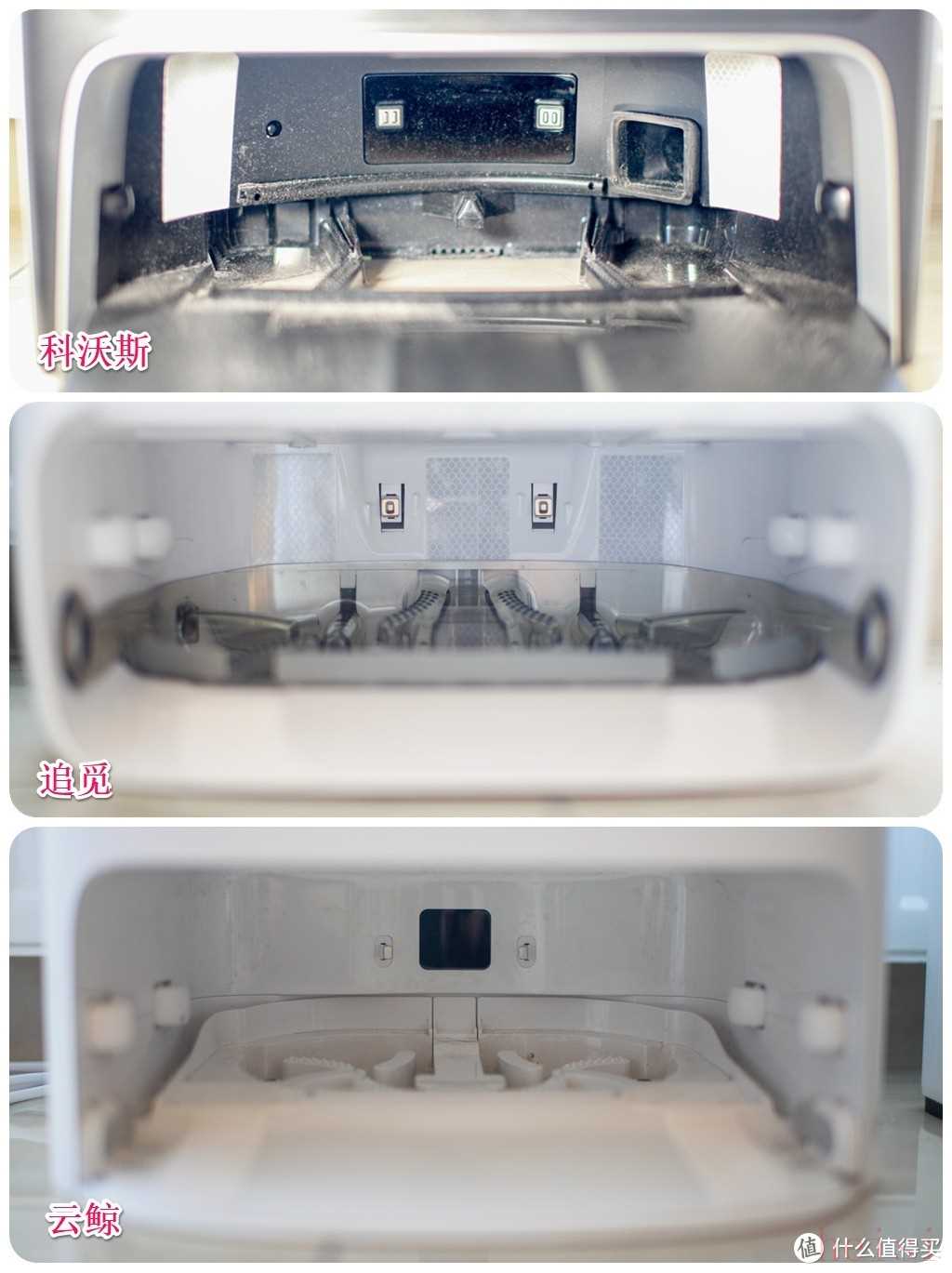 科沃斯,追觅和云鲸这三台采用旋转地擦方案的扫地机,它们的基站看起来也区别很小,都是花式刮板清洗拖布的结构,基站两侧也都安装有导向滚轮方便主机进入。其中略有区别的还是科沃斯的基站,由于具备集尘功能,因此它的内部多了一个吸尘口,我测试的这台机器似乎有一点漏灰,基站里面有点脏脏的。
