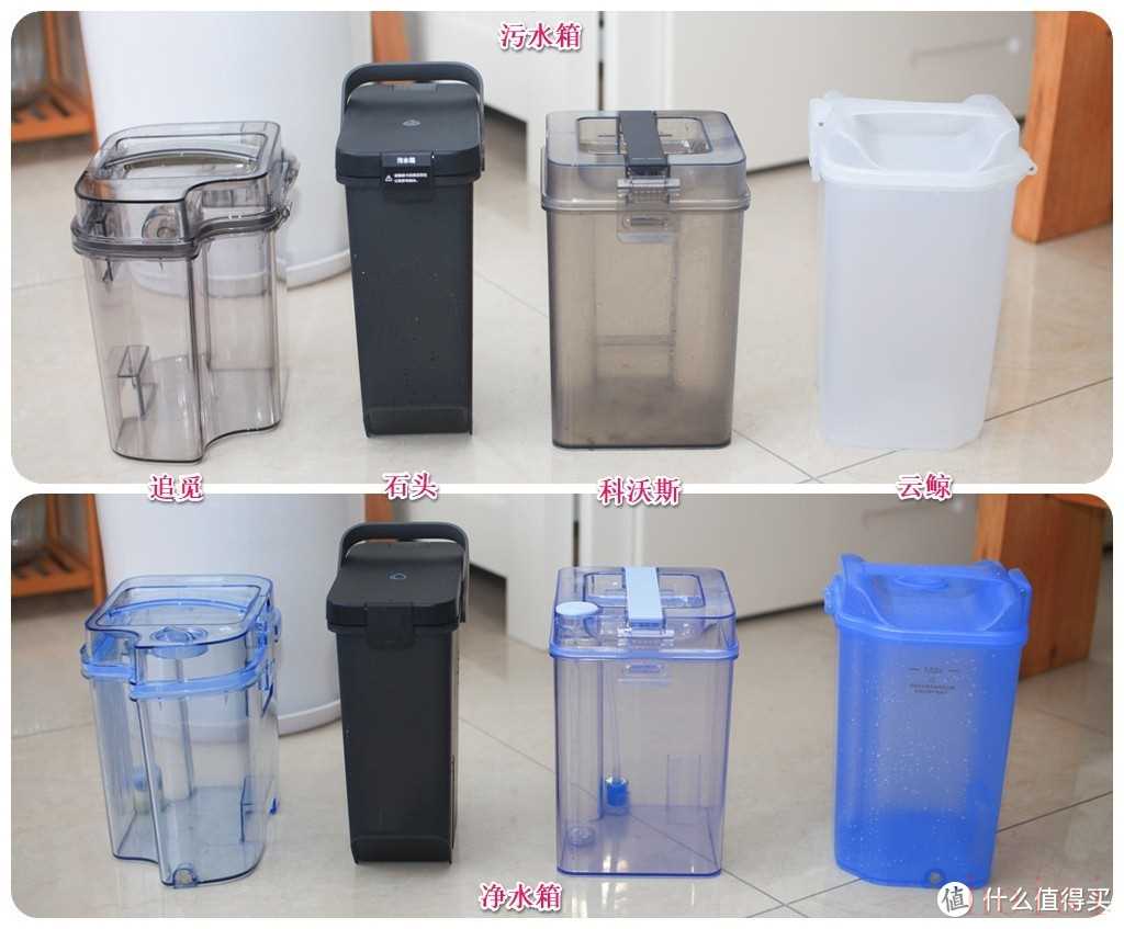 既然谈到了水箱,还是看看吧。上图里可以很明显的看出来,石头的水箱是最小的。要知道这不是石头的工程师为了减小体积做的让步,而是因为石头采用的拖地方案是目前这4台机器里最省水的(当然,还是装了上下水组件才爽)。