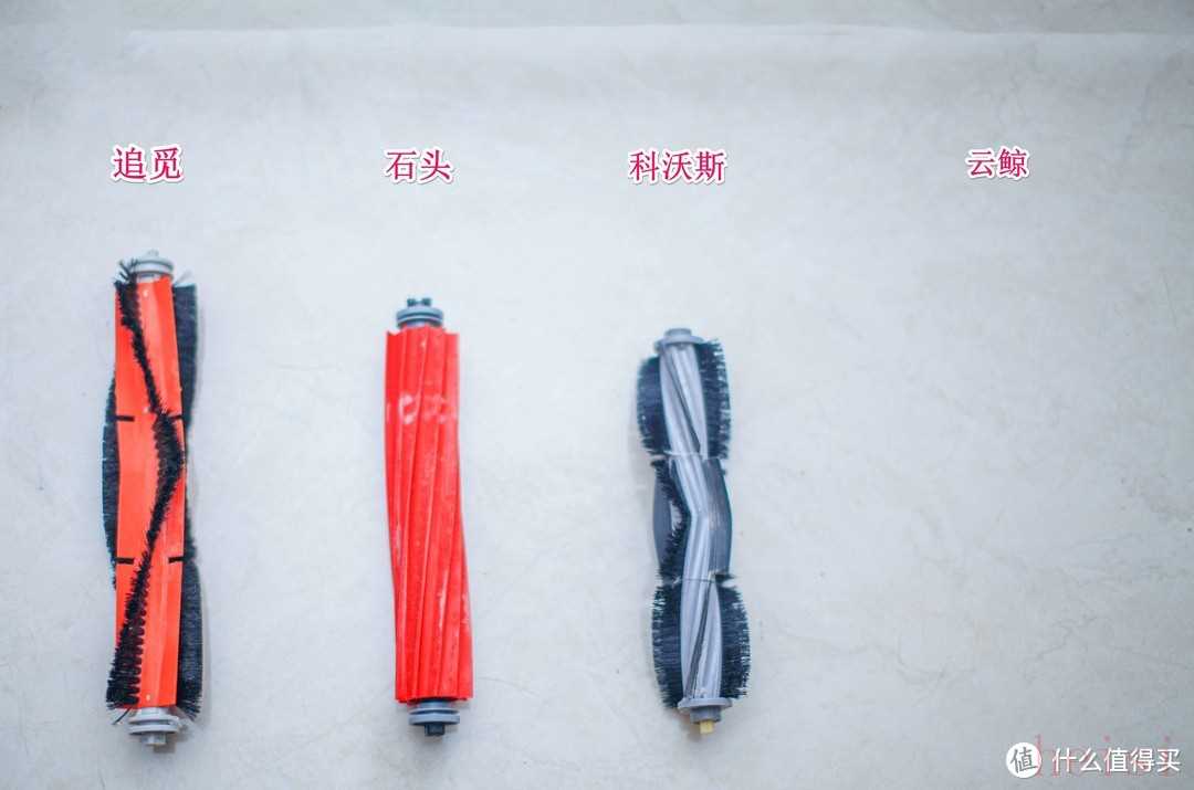 这四台机器的主滚刷也很有代表性,市面上常见的滚刷类型全部涵盖了。追觅采用了毛刷和橡胶刮间隔安装的V字造型,科沃斯也是这个方案,但增加了橡胶刮片的数量,石头则采用了目前市面上唯一的纯胶滚刷设计,抗毛发缠绕能力最强。至于云鲸,这个真没有......