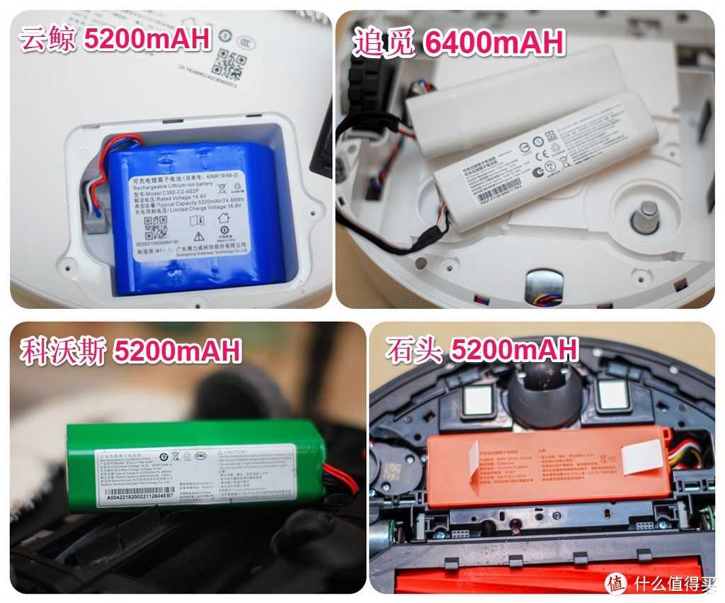 说到续航,就不得不看一下这四台机器的内置电池。其中石头、科沃斯和云鲸都采用了堪称智能扫地机标准的5200mAH锂电池,三家之间的区别只是封装方式不同,从外观上看石头的封装最为规范,科沃斯和云鲸还是老一辈电器最喜欢用的热缩膜,不过比起云鲸来科沃斯的电池还是要规整的多。
