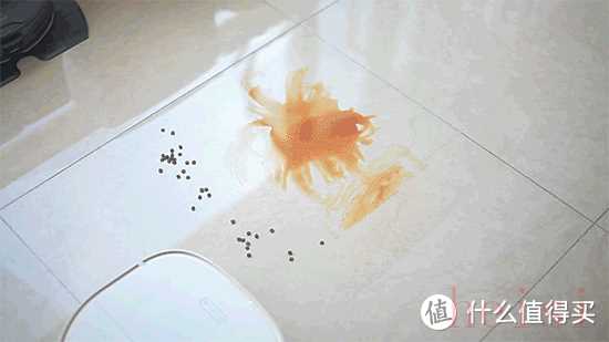 测试到科沃斯的时候,没想到作为机皇,它居然又翻车了。不知道是不是双边刷的锅,科沃斯X1对猫粮的打飞非常厉害,从上图可以看到,清扫结束后,几乎有一半的猫粮被遗漏在地面上。而酱油污渍的清洗也不甚满意,残留量甚至比追觅还要大,地面直接是花的,这不该是旗舰级的成绩呀。