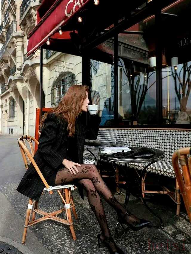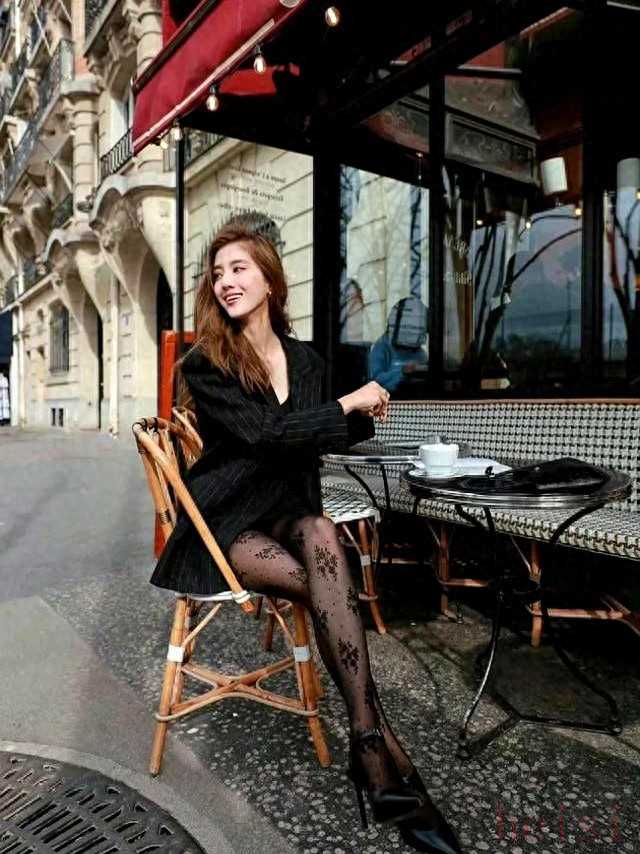 臀部后移,腰部自然内收,裙摆和丝袜之间露出一截大腿,比例立刻三七分。