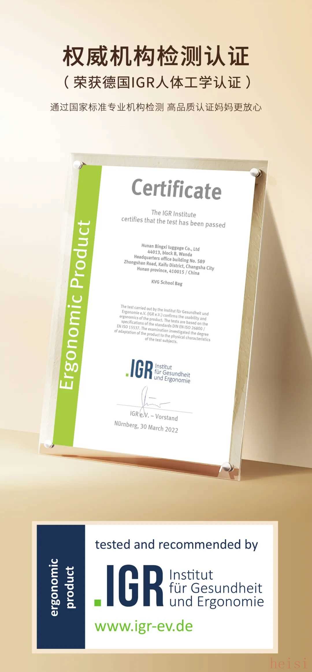 颜色都很好看,性价比真的很高,并且书包通过了SGS欧盟品质认证以及德国IGR人体工学认证,还有实用新型专利