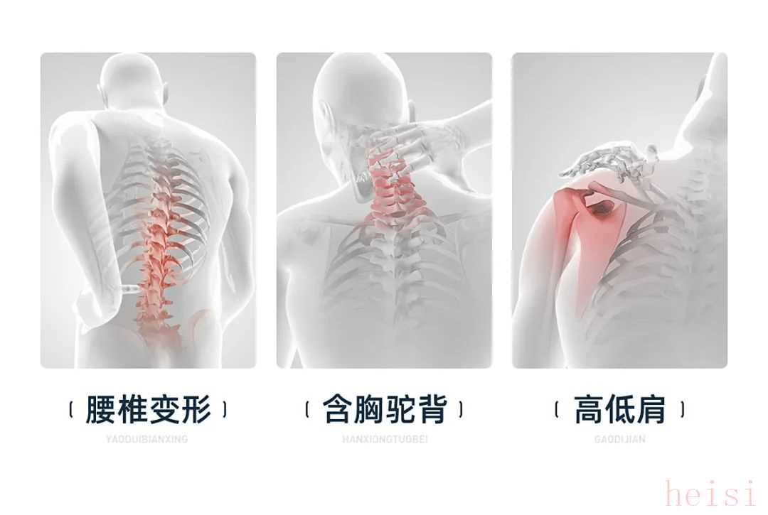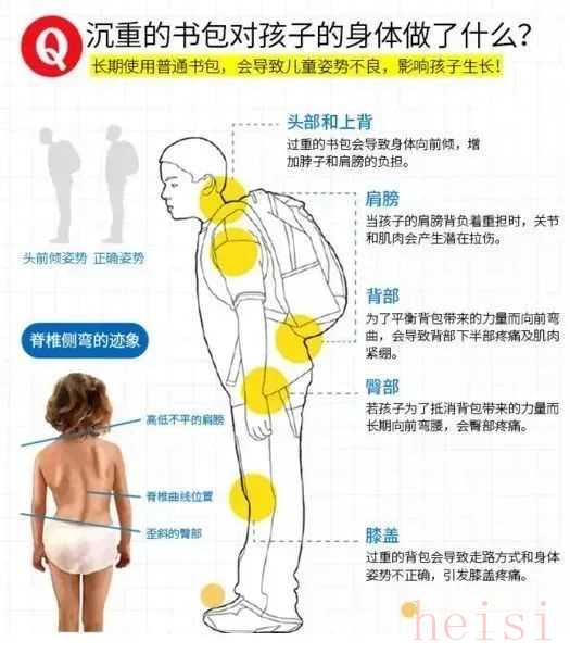 于是你慢慢发现,孩子开始弯腰驼背、高低肩、脊柱侧弯,有些甚至重的把脊背压成“C”字形。