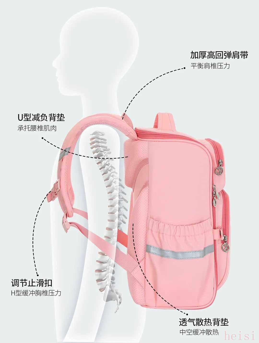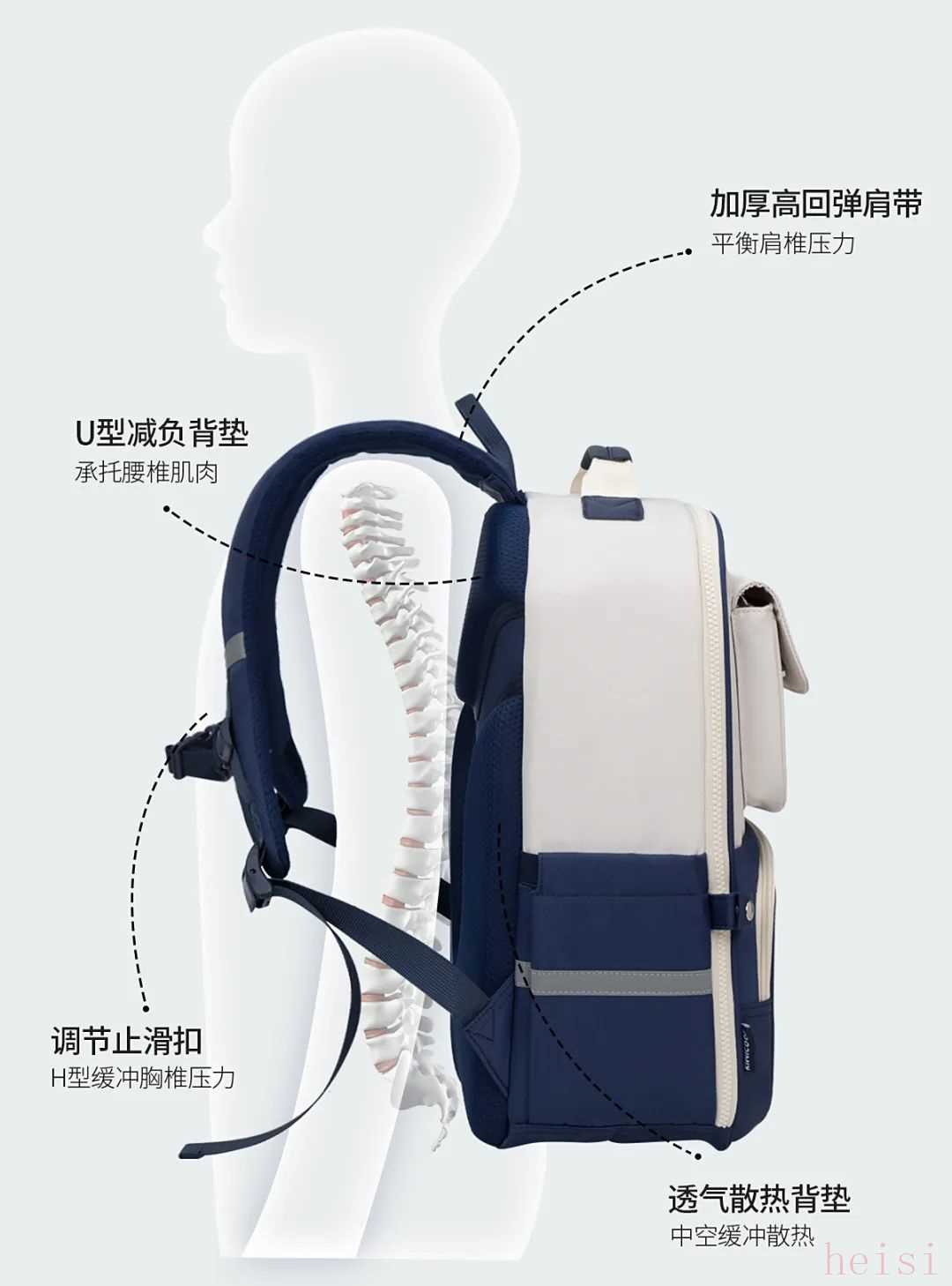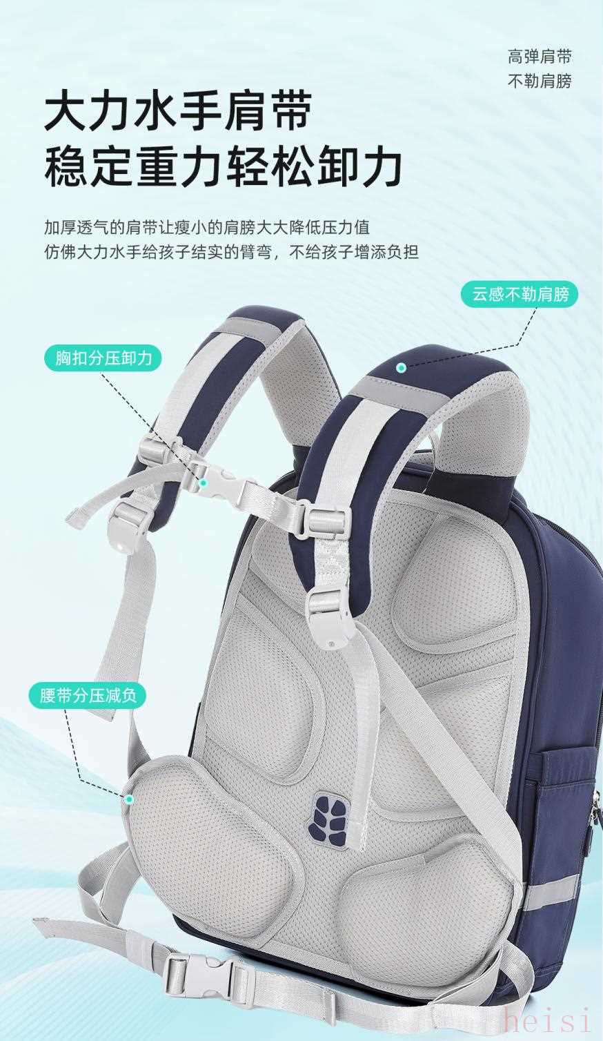 人体工程学设计,精准计算贴合孩子背部曲线,起到良好支撑作用,肩、腰、背三点分力,能把压力均匀分布开,减少对脊柱的压力,科学地保护娃的脊椎。