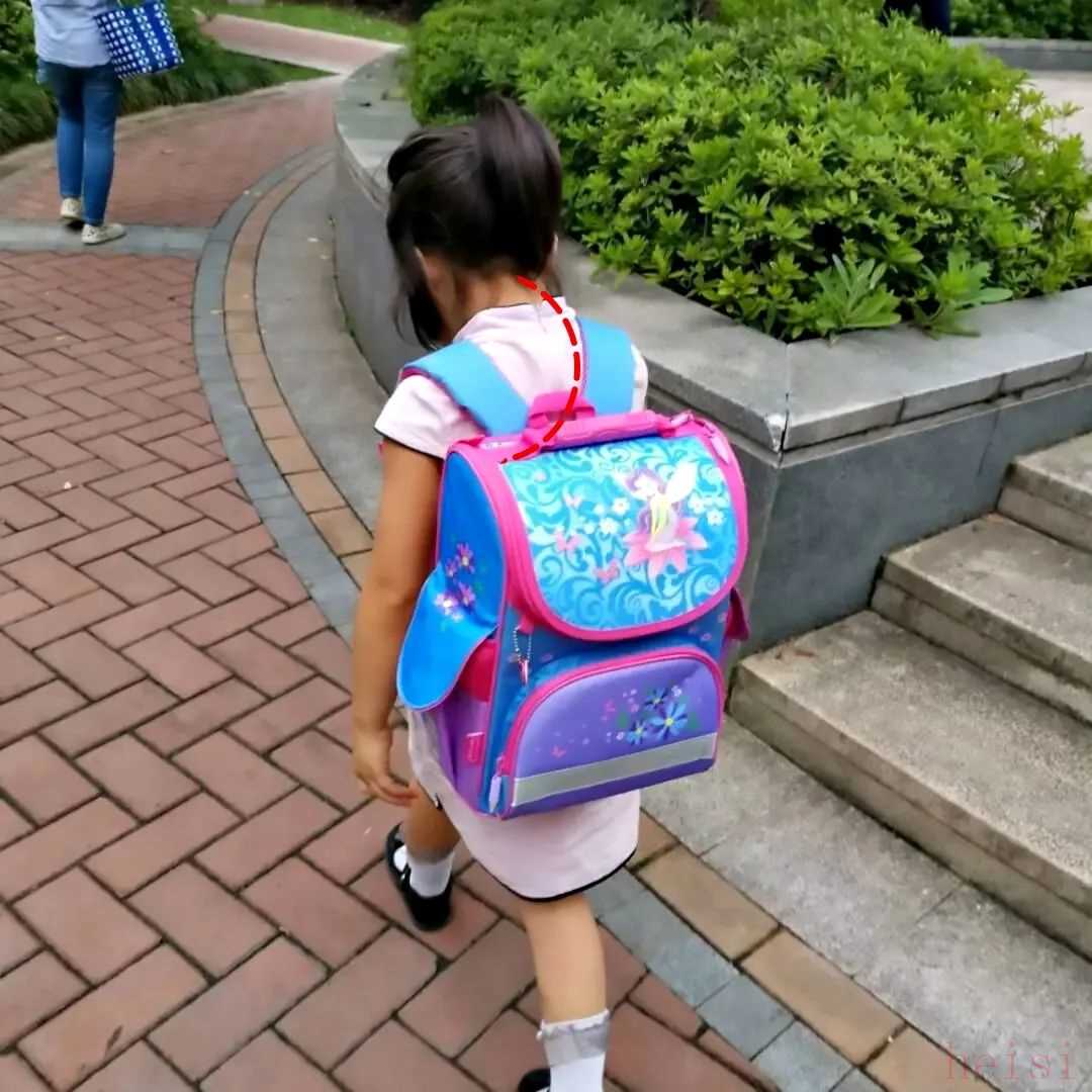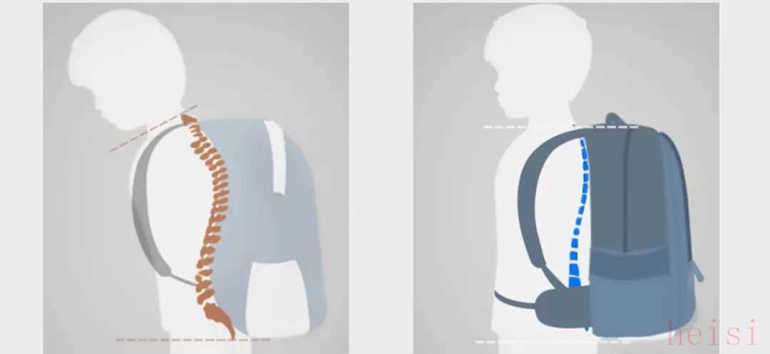 这个时候书包一重,背部重量突增,孩子为了平衡书包往后扯的拉力,很容易出现前弓背、伸脖子等等一些不正确的姿势。