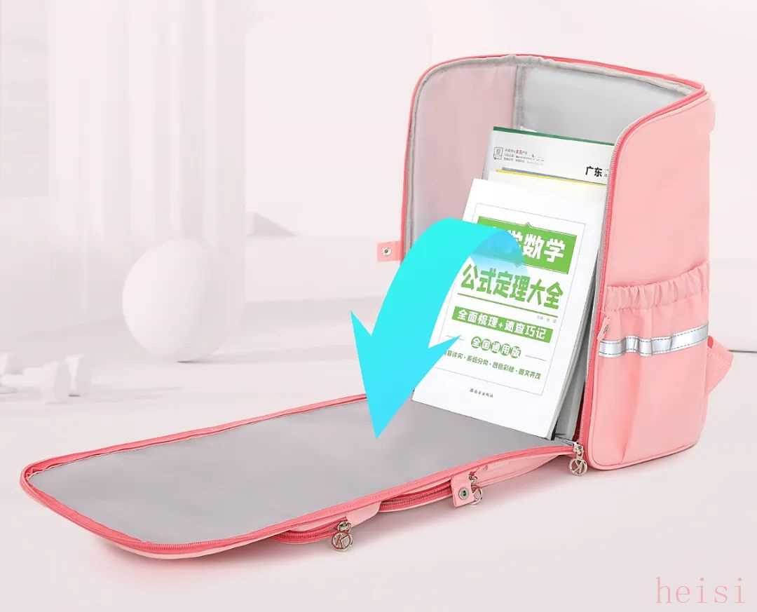 一片式翻盖结构,一体开袋,一根拉链贯穿书包,开口大,方便取放书本,也很方便清洗