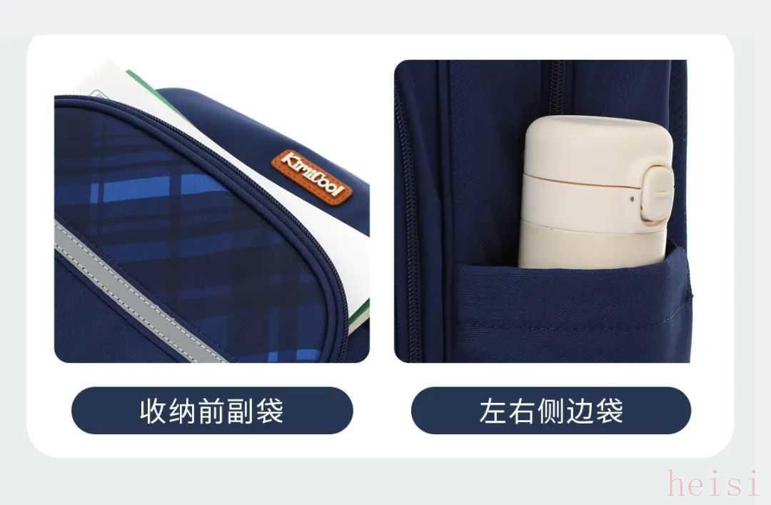 科学分区·超大容量。前副袋+双侧边袋+大开口主袋,课本、文具、水杯分区收纳,轻松装下整个学期用品!