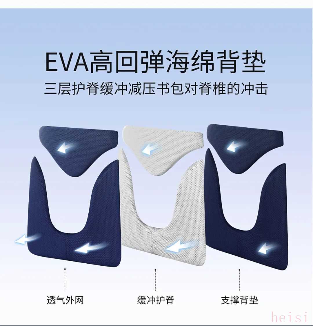 EVA厚实高回弹海绵背垫,三层护脊,相当于给背脊安上“安全缓冲垫”