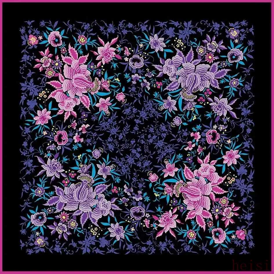 丝巾灵感来源于中国丝绸博物馆馆藏精品——“黑地流苏刺绣大披肩”,寓意华贵丰茂、幸福和平。图案以牡丹为基础元素,用色彩渲染的手法体现传统刺绣的细腻柔美,构图细致繁而不乱,花卉与枝叶通过颜色的透明对比突出丰富的层次感。
