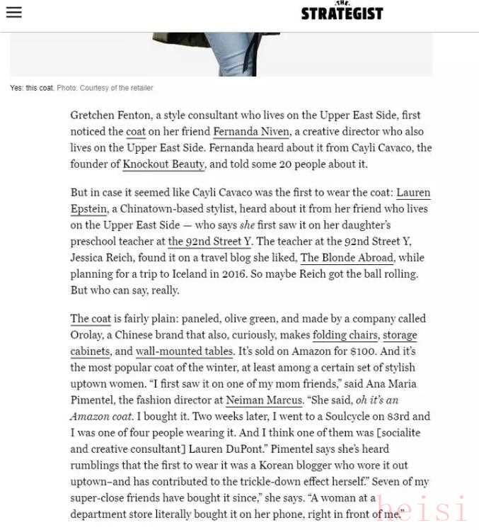 真正让他发现Orolay彻底火了是去年3月。那个月的月底,美国《纽约杂志》主编发了一篇文章(经核实,去年3月27日,《纽约杂志》曾发布一篇文章,题为《不太可能的故事:这件在亚马逊上卖140美元的羽绒服拿下了上东区》。纽约曼哈顿的上东区是富人区,有不少名牌专卖店),说的是自己在纽约富人区发现很多名人、设计师居然都在穿同一品牌的羽绒服,调查后才发现,这是一款来自中国的羽绒服。