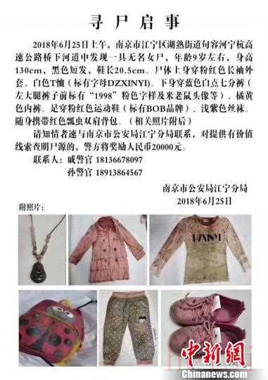 一个月前的6月25日,南京江宁公安分局官方微博@江宁公安在线发布一则寻尸启事。根据当时的通报,“6月25日上午,南京市江宁区湖熟街道一河道中发现一具无名女童遗体,年龄9岁左右,身高135cm,黑色短发,鞋长20.5cm。遗体上身穿粉红色长袖外套、白色T恤(标有字母DZXINYI)。下身穿蓝色白点七分裤(左大腿裤子前标有‘1998’粉色字样及米老鼠头像等)、橘黄色内裤。足穿粉红色运动鞋(标有BOB品牌,32码)、浅紫色丝袜,随身携带红色瓢虫双肩背包。”
