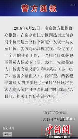 中新网南京7月25日电 (记者 申冉)25日,南京市警方向社会通报,一个月前在该市发现的无名女童尸体,于7月25日抓获两名犯罪嫌疑人,分别系女童的生父和祖父,两人供述系将被害女童推入河中致其溺亡。