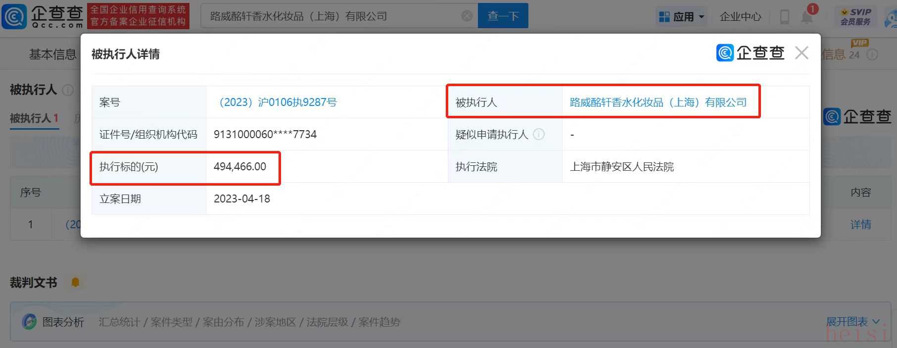 信网4月23日讯企查查显示,近日,路威酩轩香水化妆品(上海)有限公司新增一则被执行人信息,执行案号为(2023)沪0106执9287号,被执行金额超49.44万元,执行法院为上海市静安区人民法院。