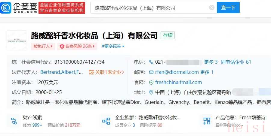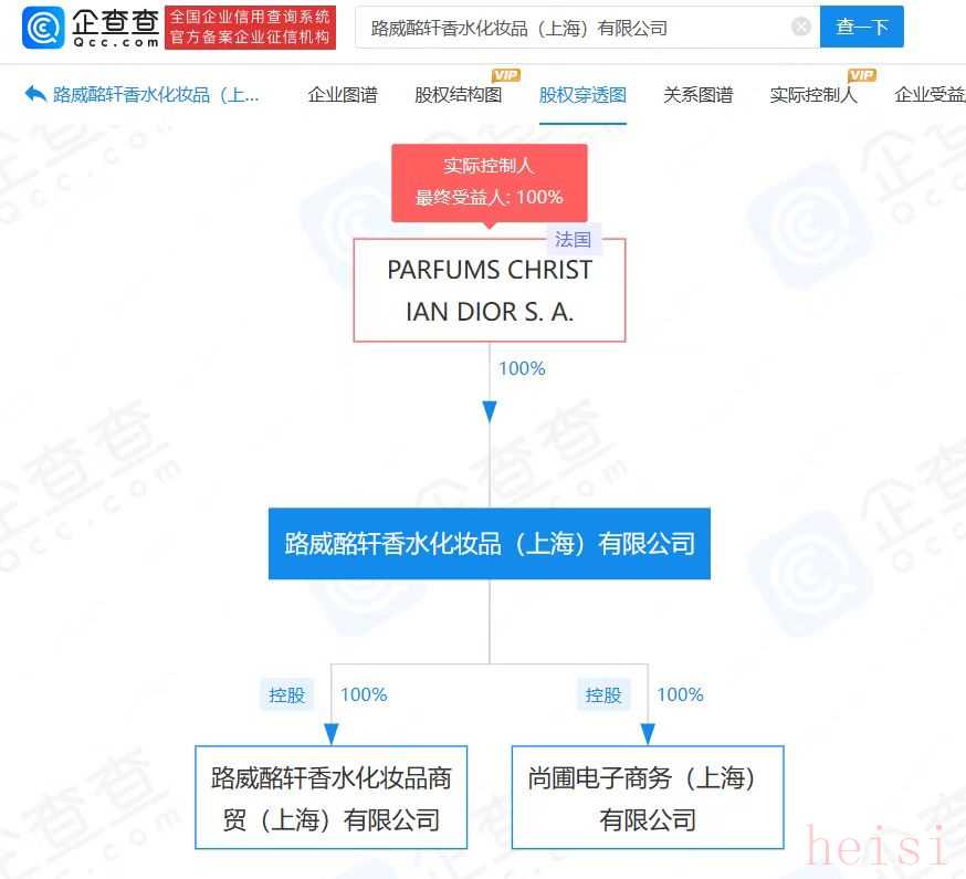 企查查信息显示,路威酩轩香水化妆品(上海)有限公司成立于2000年,注册资本120万美元,由法国公司PARFUMS CHRISTIAN DIOR S. A. 全资持股。据了解,该公司旗下产品涵盖Dior(迪奥)、Guerlain(娇兰)、Givenchy(纪梵希)等品牌香水化妆品。(信网记者)