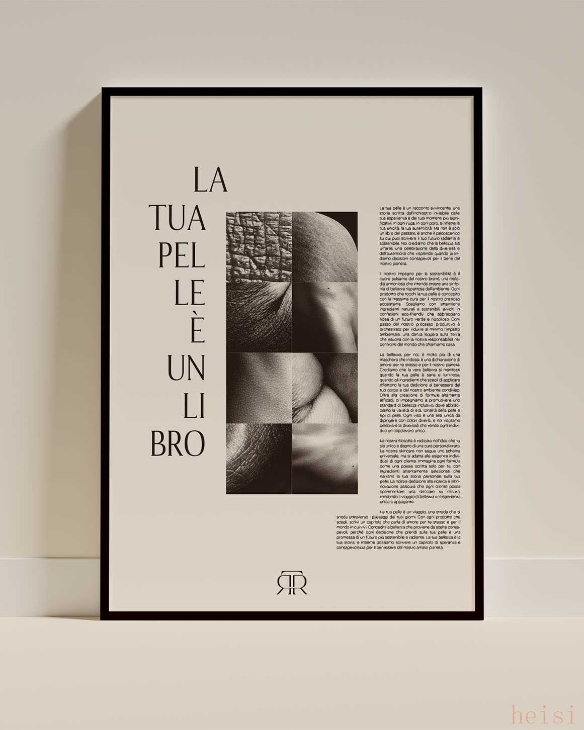 品牌重塑过程包括创建全新的标志和符号。定制的衬线字体从新商店的建筑拱门中汲取灵感,R字母上的独特连字赋予了个性和独特性。RT字母组合被设计成一个可识别和标志性的品牌元素。整体视觉身份围绕一个概念展开,即完美的美丽是不存在的——每一张皮肤都有自己的故事。为了突出这一点,使用了褶皱织物、针织纹理和皮肤细节等材料的特写镜头来构建一个独特而连贯的视觉叙述,庆祝个性和真实性。