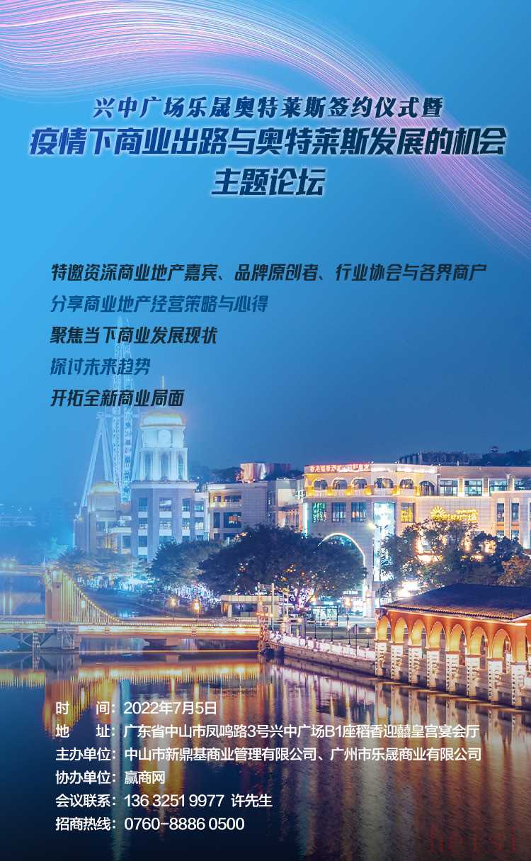 7月5日下午3点30分,《疫情下商业出路与奥特莱斯发展的机会》主题论坛暨兴中广场乐晟奥特莱斯签约仪式将在中山市石岐区兴中广场举行。届时,兴中广场乐晟奥特莱斯引入的首批20余家商户将现场签约,中山城区的商业板块将迎来新零售新消费的全新发展机遇。