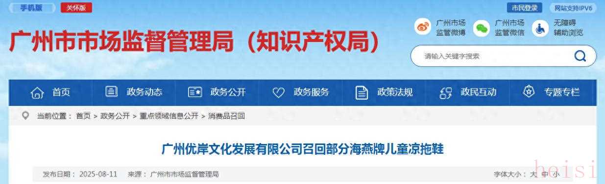 根据公开信息,广州市市场监督管理局发布了一则"警告性通知",涉及召回"广州优岸文化发展有限公司"生产、"广州海燕儿童用品有限公司"委托加工的"海燕牌"部分儿童凉拖鞋。