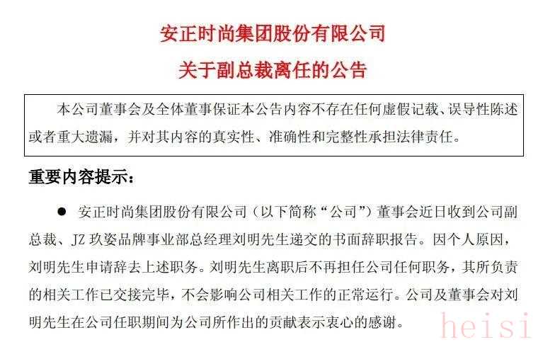 安正时尚公告,副总裁、JZ玖姿品牌事业部总经理刘明因个人原因离职,已完成工作交接,离职后不再担任公司职务,董事会感谢其任职贡献。