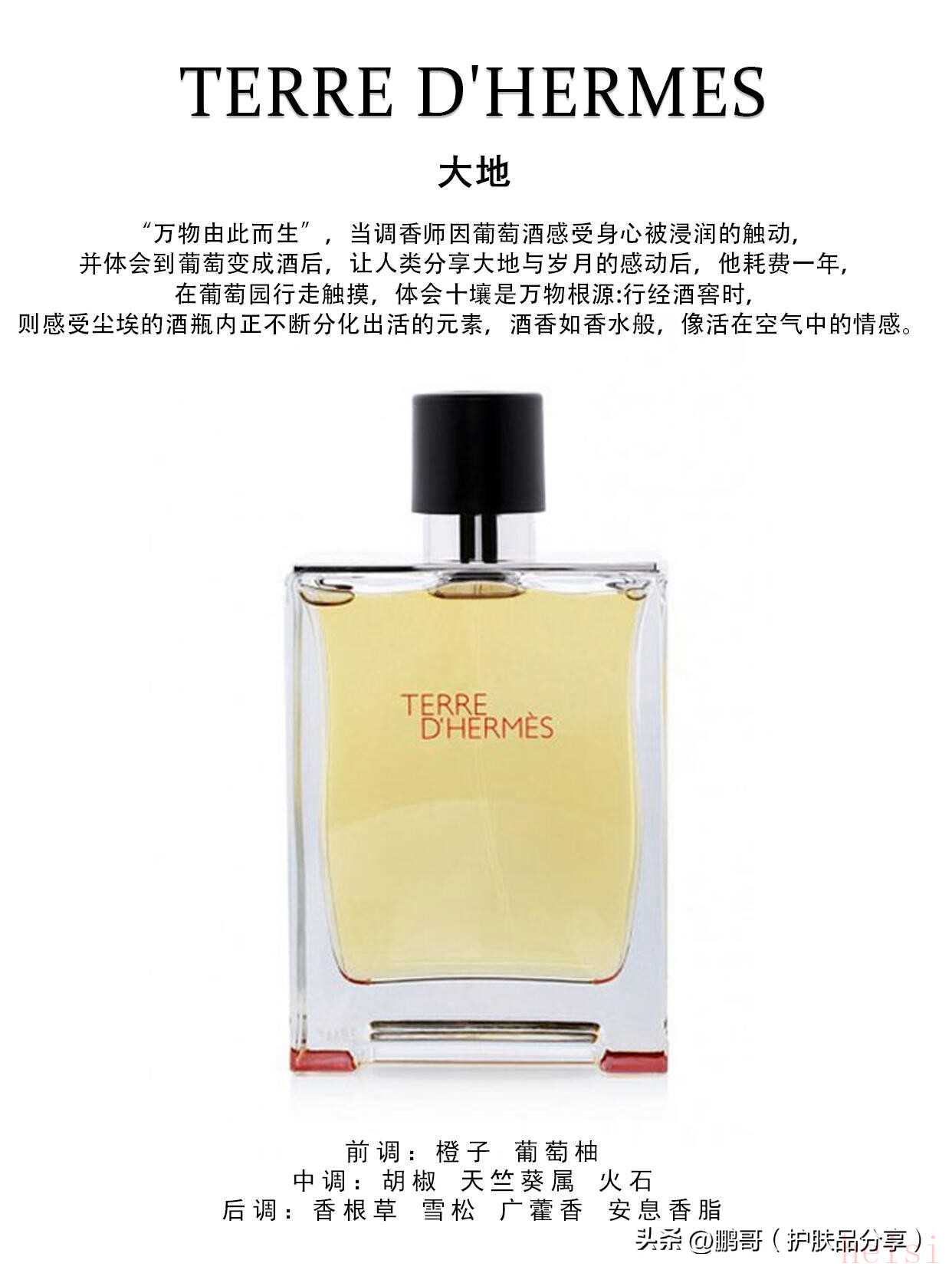 前调带来薄凉清透感又带有一丝寒意,中调茶叶混合着皂感清爽淡雅,尾调变得温柔绵长起来,整体干净清新带来舒适的感觉,很暧昧但又沉稳的味道,就像冬天优雅的男士,很冷淡的味道。采用的是常见的柑橘调开场,淡淡的稍微有点酸涩,伴随着茶香和黑加仑独具清甜感的果香,柠檬橙花的那缕青涩感,被很好的中和了,整个香调变的很轻松,后调果香茶香逐渐转薄。越到后面香味越惊艳,据说是朴灿烈同款香水,就是留香不是很长,用略带皂感的麝香+自带清凉感的白松香打底,完美勾勒出了银色山泉洁净的冷感。第六款:爱马仕大地香水“万物由此而生”,当调香师因葡萄酒感受身心被浸润的触动,并体会到葡萄变成酒后,让人类分享大地与岁月的感动后,他耗费一年,在葡萄园行走触摸,体会十壤是万物根源:行经酒窖时,则感受尘埃的酒瓶内正不断分化出活的元素,酒香如香水般,像活在空气中的情感。