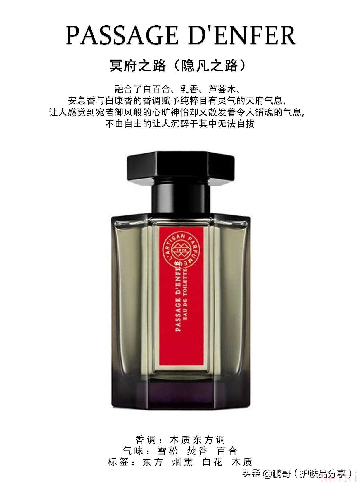 前调香柠檬、橘子、蜜橘、公丁香,果香开场;中调茶叶、茉莉、玫瑰、胡椒、康乃馨,花香与茶香交融;后调日本扁柏木、雪松、麝香、橡木苔,增添木质沉稳气息。绿感很重的一支香水,一秒到初夏的感觉,它的味道很干净很简单,能闻到梨、铃兰、柑橘的混合,但都是若有似无的,很适合小白花类型的女生,非常小清新的一支香水。一颗青酸大梨在夏天尤为解腻呀!半酸半甜的汁水加入了柑橘打底,鼻息间又钻入了阵阵沁凉的花果香气,像温度正是适宜的春夏之交。第三款:阿蒂仙冥府之路融合了白百合、乳香、芦荟木、安息香与白康香的香调,赋予纯粹目有灵气的天府气息,让人感觉到宛若御风般的心旷神怡却又散发着令人销魂的气息,不由自主的让人沉醉于其中无法自拔。
