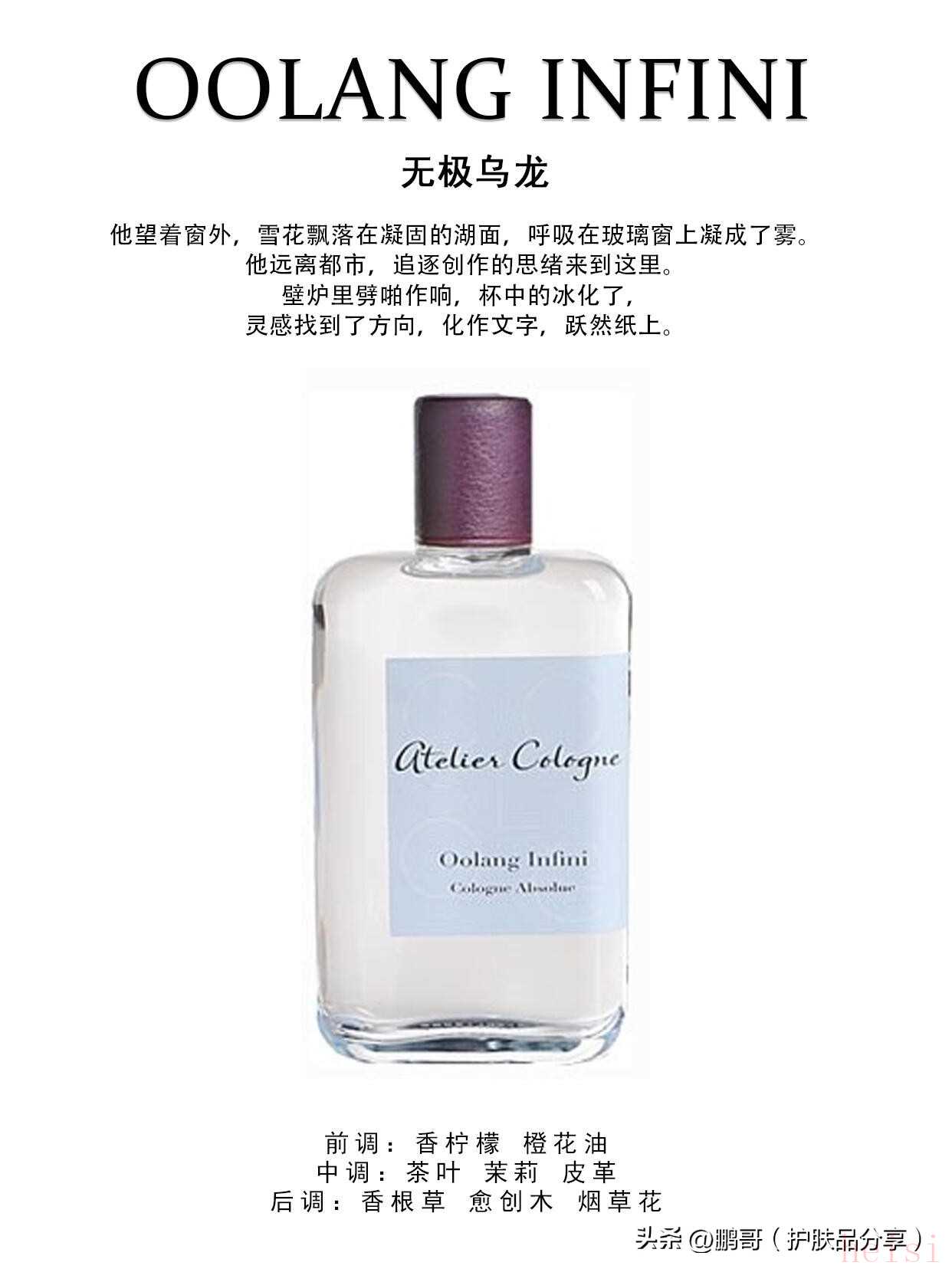 前调略带酸意的焚香,混合着木头和灰烬的味道,中调百合花香迷人沉静冷淡,尾调禁欲系的木质焚香调沉静内敛,散发出一种高贵气质,有种“生人勿近”的魅力。刚喷出来可以闻到陈腐的酸味混合着花香,隐约有一种辛辣味,很快变成有点奶香的檀木香味,后调多种香料呈现,恍惚间传来一阵焚香气息,一种温柔深沉的木质焚香。冥府之路,其实是纪念阿蒂仙品牌的一款香水,阿蒂仙总部所在马路,名字叫“地狱之路”,后来进入中国后,名字变成“冥府之路”,有一点纪念的意义在其中,这是一款争议很大的香水。第四款:欧珑无极乌龙香水他望着窗外,雪花飘落在凝固的湖面,呼吸在玻璃窗上凝成了雾,他远离都市,追逐创作的思绪来到这里,壁炉里劈啪作响,杯中的冰化了,灵感找到了方向,化作文字,跃然纸上。