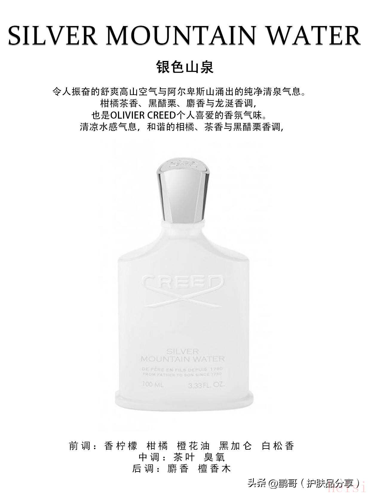 欧珑无极乌龙香水男女都可,其实我不太爱木质调,最近却对它意外上瘾,非常淡雅轻盈通透的茶香+木质香的香水,个人觉得总体气质在:低调、干净、文艺、雅致这个范畴。第一下觉得佛手柑的味道比较明显,然后就是淡淡茶香混合淡淡木质的味道,整体都很清凉、不发闷、不厚重,更不会脂粉甜腻,女生用,它的气质洒脱自信,宁静而温和,尤其穿亚麻衬衫,或者三宅一生这种简洁的衣服,用它!真的绝了!不费力地把从容自信握在手里。男生用的话,不得不说,无极乌龙香水是非常“男朋友”的木质香,闭上眼睛闻到男生身上这种味道,好感度会很高,是我喜欢的干干净净,低调而别致的人。第五款:拿破仑银色山泉令人振奋的舒爽,高山空气与阿尔卑斯山涌出的纯净清泉气息,柑橘茶香、黑醋栗、麝香与龙涎香调,也是OLIVIER CREED个人喜爱的香氛气味,清凉水感气息,和谐的相橘、茶香与黑醋栗香调。