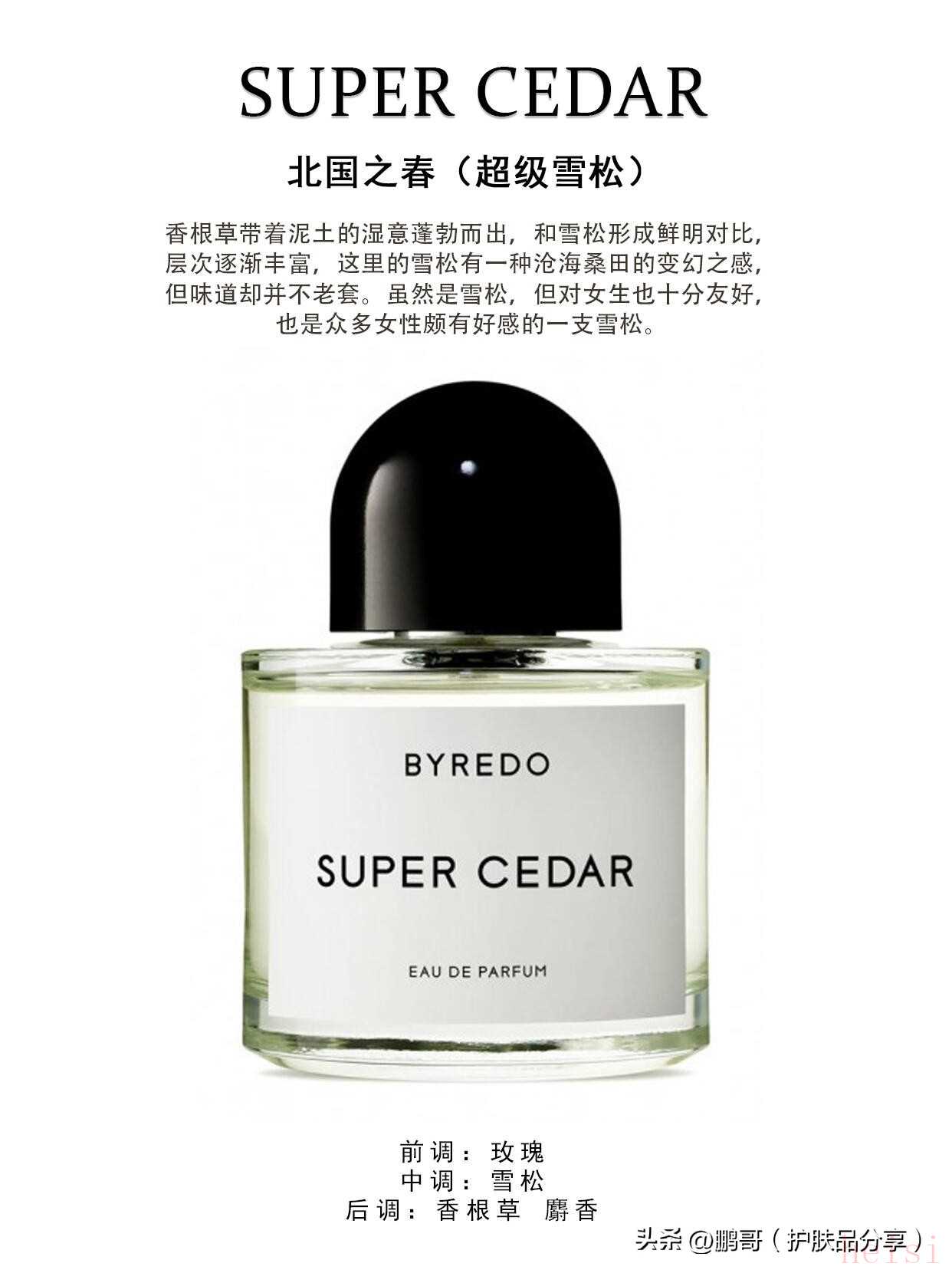 对于这些香水来说,每个人的感受都会有所不同,有人喜欢它的自然与宁静,有人喜欢它那淡淡草木气息,仿佛你刚刚漫步在晨露滋润的草地之上,每一步都踏出了清新的芬芳,有人喜欢它,如同山涧溪流潺潺,带着一丝丝凉意。第一款:百瑞德超级雪松香根草带着泥土的湿意蓬勃而出,和雪松形成鲜明对比,层次逐渐丰富,这里的雪松有一种沧海桑田的变幻之感,但味道却并不老套。虽然是雪松,但对女生也十分友好,也是众多女性颇有好感的一支雪松。
