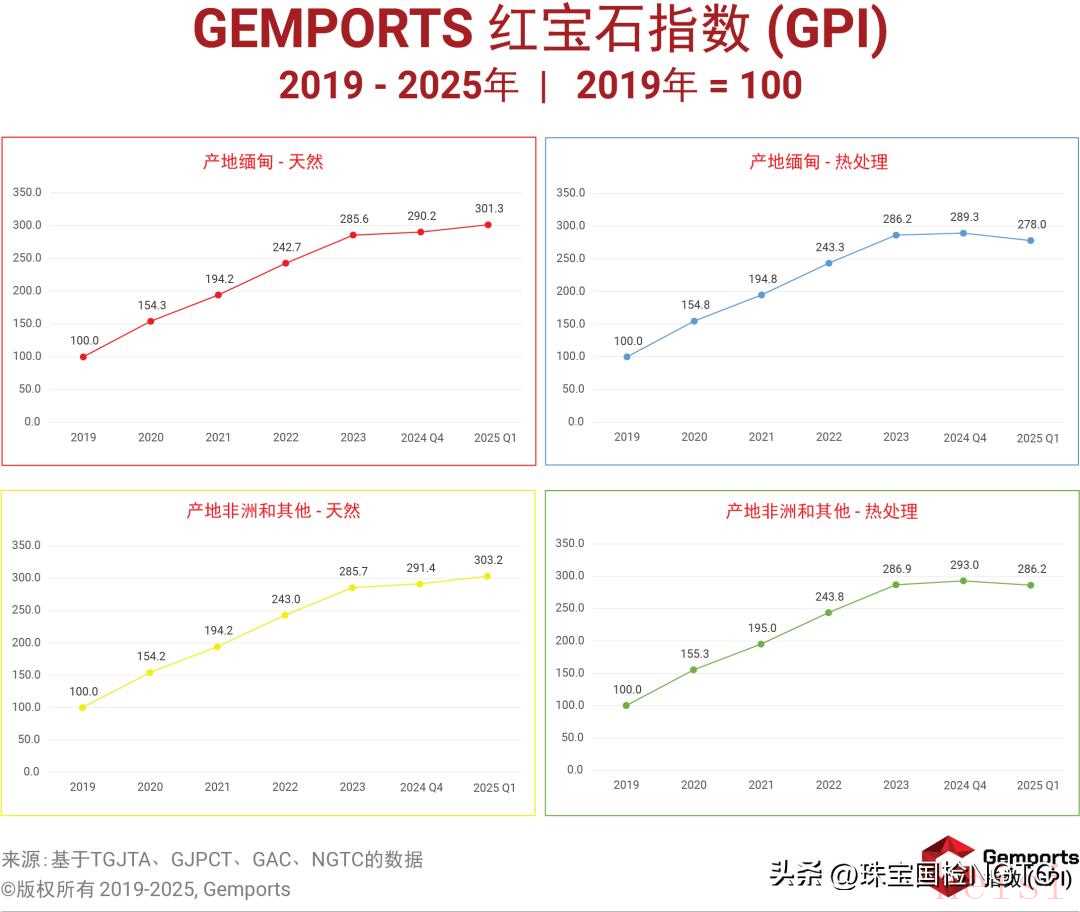 近日,“Gemports”国际彩色宝石贸易信息平台联合中国珠宝玉石首饰行业协会(GAC)、珠宝玉石首饰国检集团(NGTC)、泰国珠宝玉石首饰行业协会(TGJTA)及泰国珠宝玉石首饰贵金属联盟(GJPCT),通过线上形式在泰国曼谷共同发布2025年第一季度《“Gemports”红宝石指数(GPI)》和《“Gemports”蓝宝石指数(GPI)》。2025年第一季度《Gemports红宝石指数(GPI)》