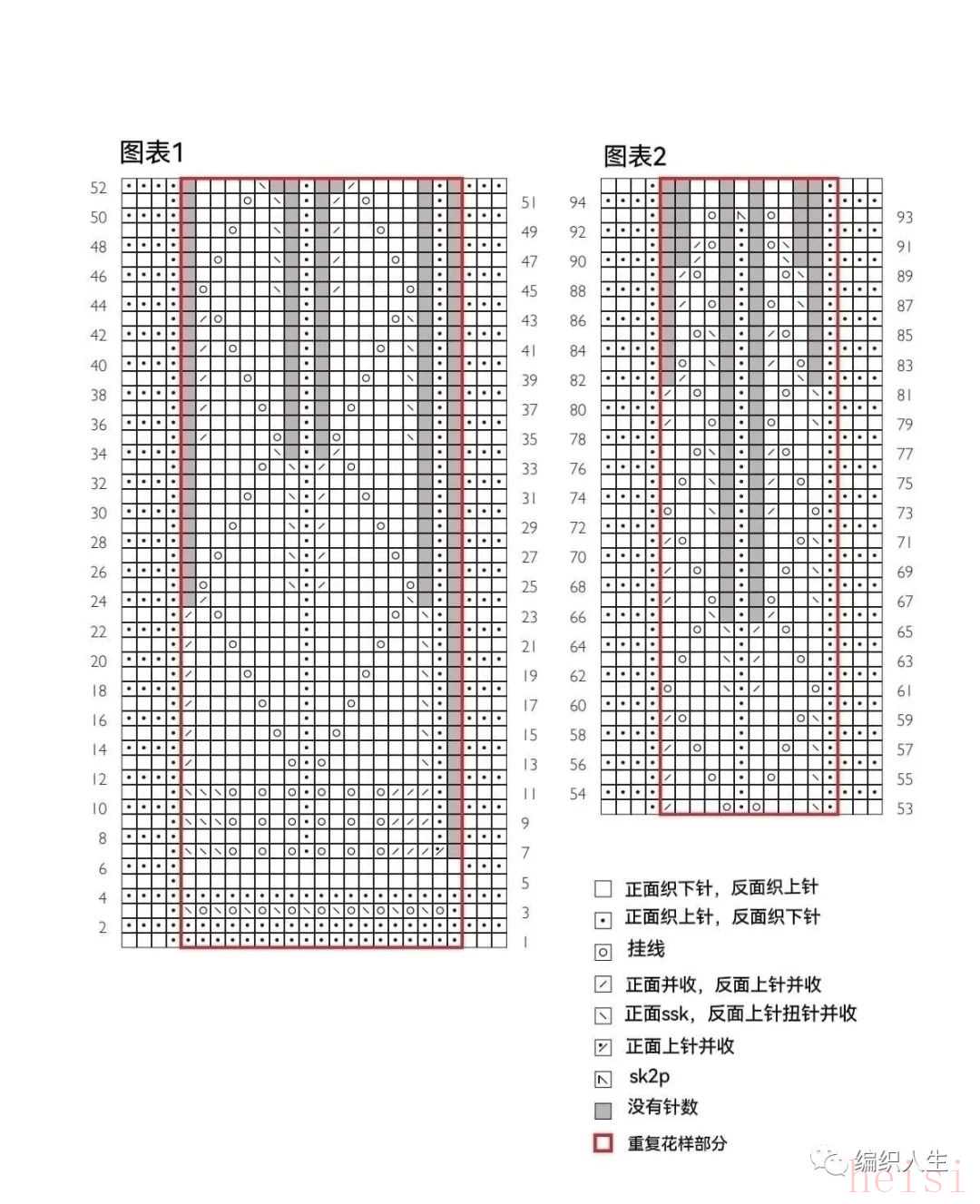 用3.75mm针,长尾起针843针,按下面花样图表织图1织完1-52行,共44个花样,织完图表1后剩535针,然后再按图表2织完52-94行,最后剩271针,每个花样6针,松松的平收掉,下水,整型,完工。