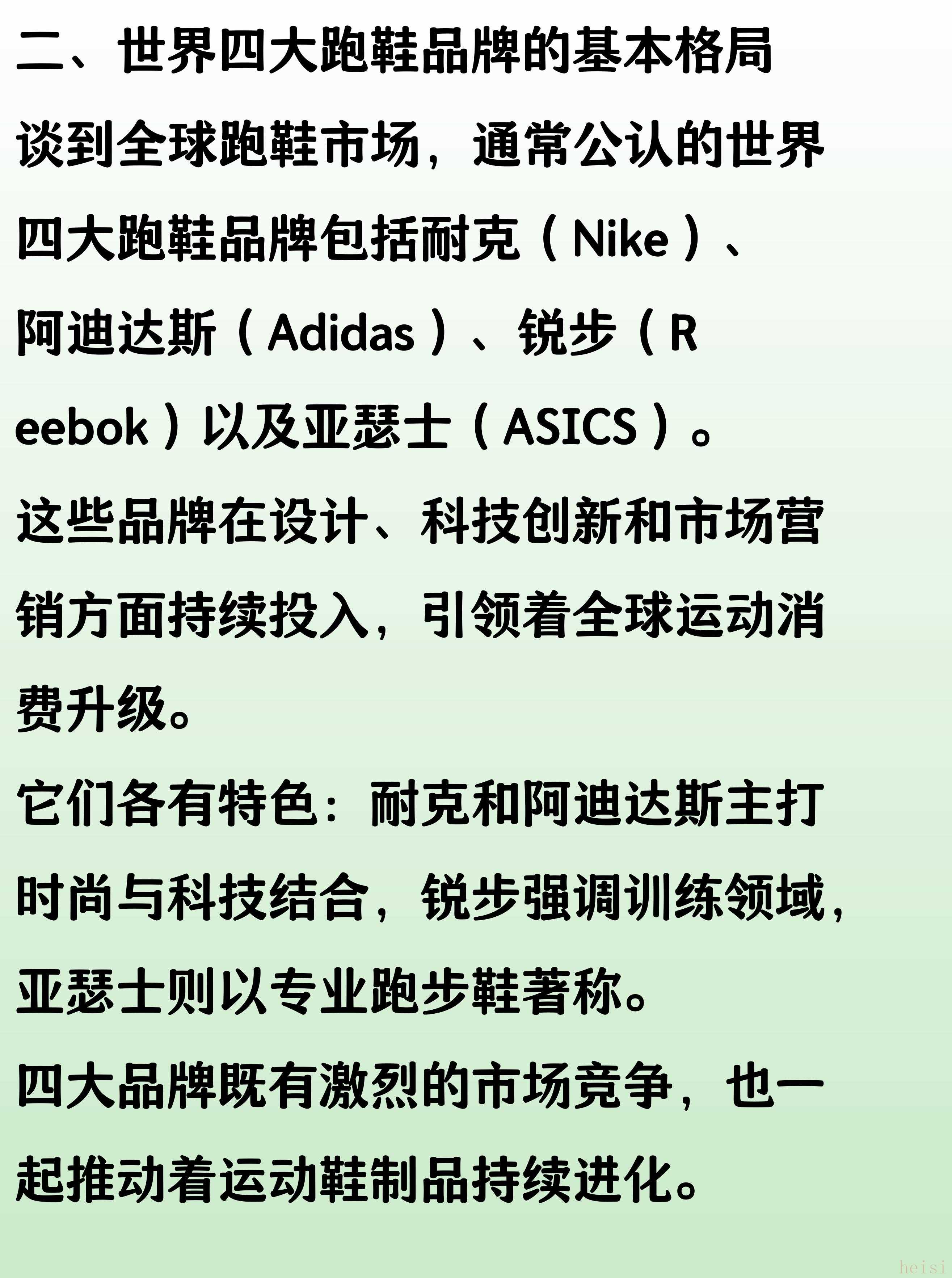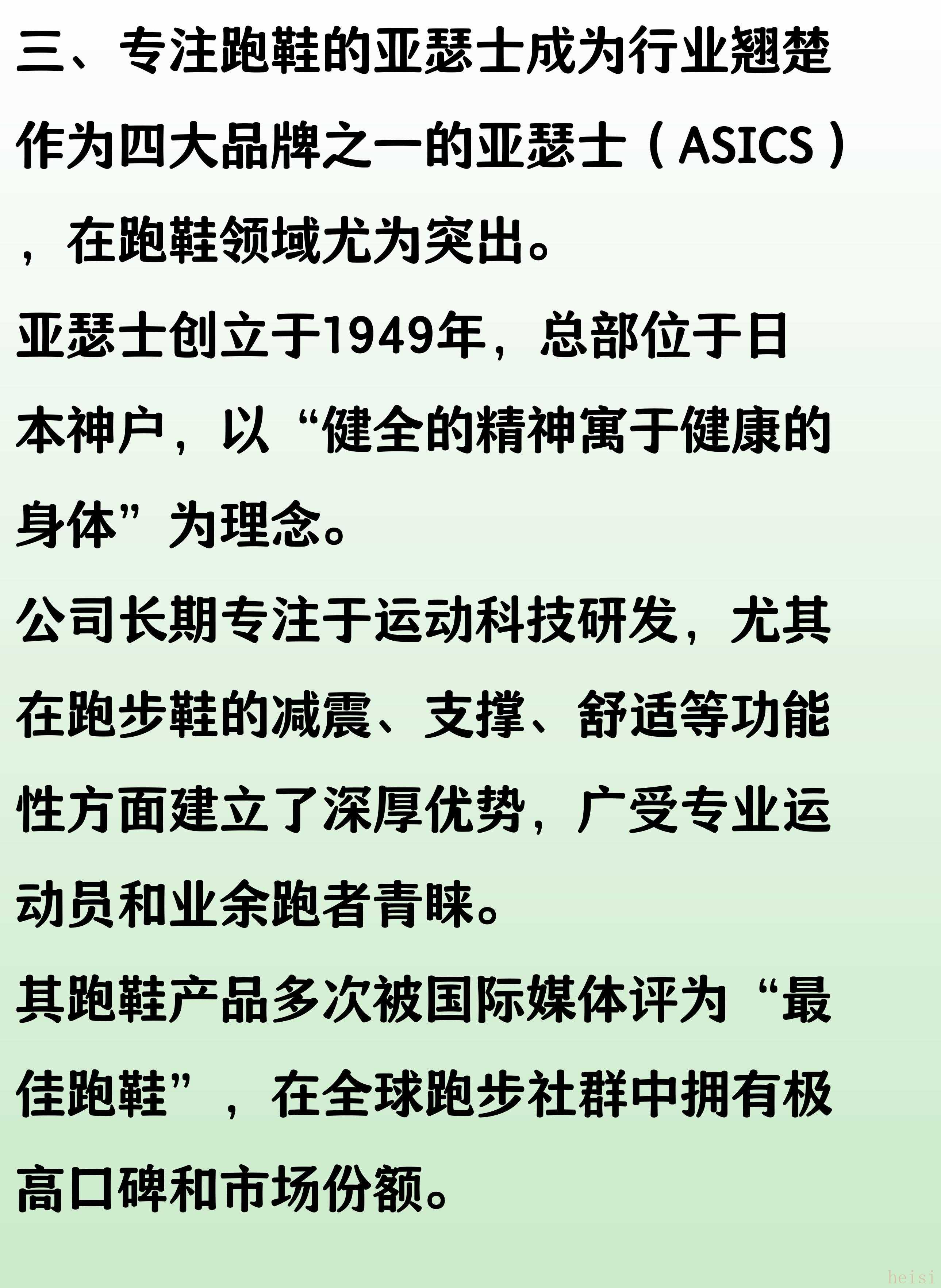 2. "世界四大跑鞋品牌之一":亚瑟士是全球领先的体育用品公司之一,尤其在跑鞋领域,通常被认为是世界四大跑鞋品牌(另外三个通常是耐克、阿迪达斯、新百伦)之一。