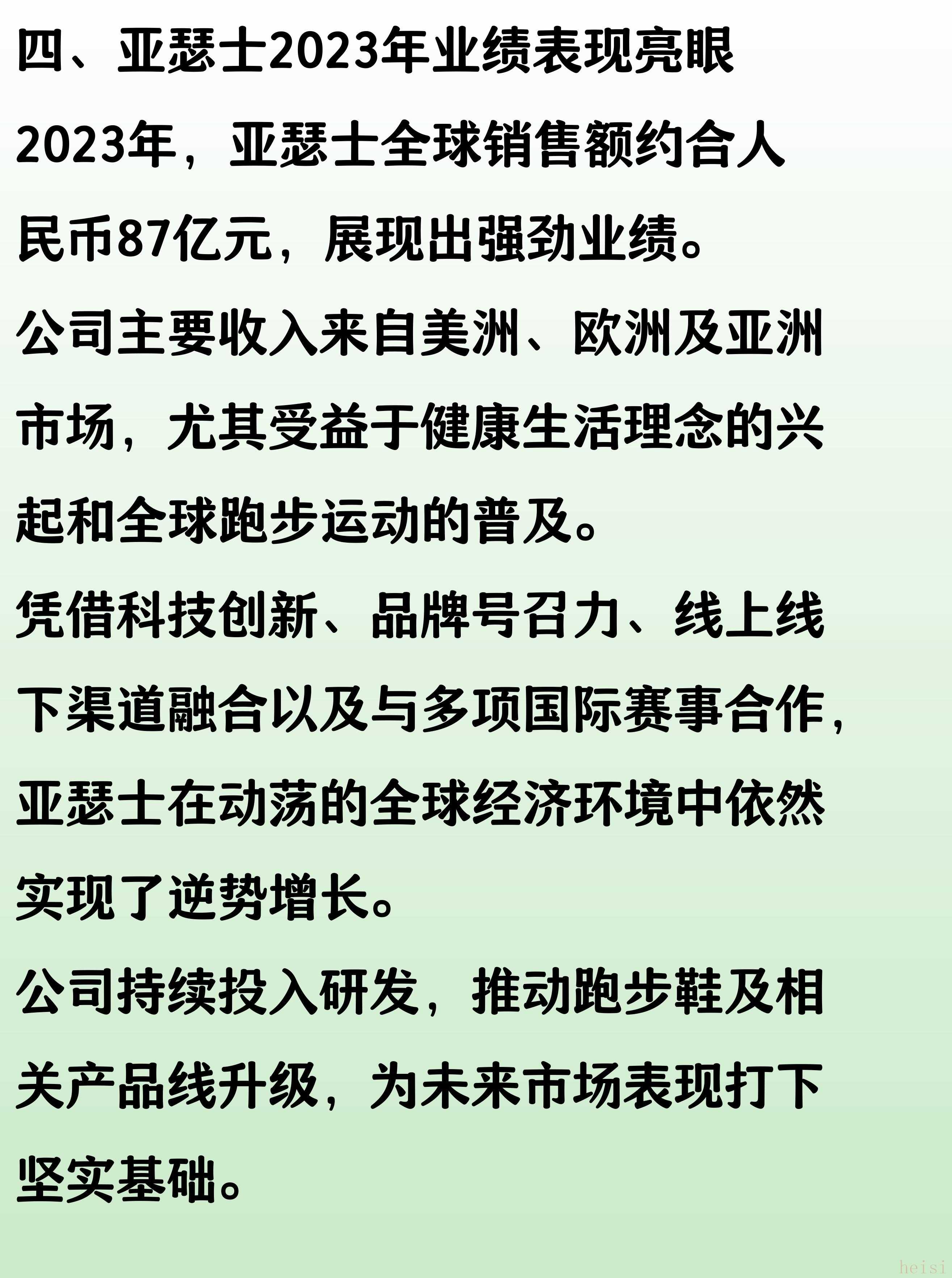 3. "去年进账87亿元":根据亚瑟士2023财年的财报,其在中国大陆市场的营收约为1,293亿日元(约合人民币66亿元)。虽然87亿元可能是指特定年份、特定区域(如中国大陆)或者特定业务(如跑鞋),但这个数字与亚瑟士的业绩相符,属于其重要市场表现。