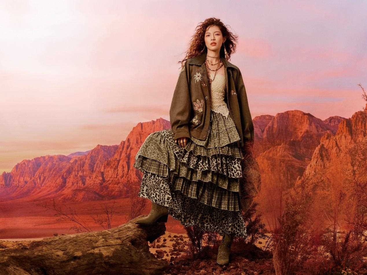 漫步系列单品之间,仿佛翻阅一本旅行手札:飘逸印花长裙以灵动笔触定格热带岛屿的热烈气息,绚丽的植物图案在垂坠面料上舒展蔓延;米白针织套装以细致的钩花工艺打破常规,若隐若现的肌肤与宽松廓形碰撞出慵懒随性的腔调,勾勒出洒脱不羁的摩登态度;西部风格麂皮夹克更将硬朗与柔美巧妙融合,复古工艺搭配精致刺绣纹样,硬朗廓形中流淌着细腻巧思,诠释出不拘一格的率性风格。