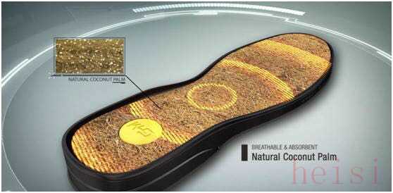 中垫采用天然椰棕,呈现立体网状结构,透气、吸湿,同时加入银离子分子技术,强效破坏细菌寄生环境,保持鞋内干爽清洁。